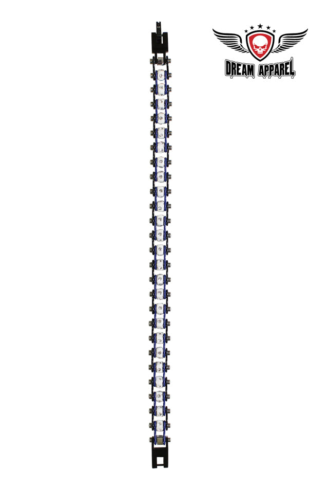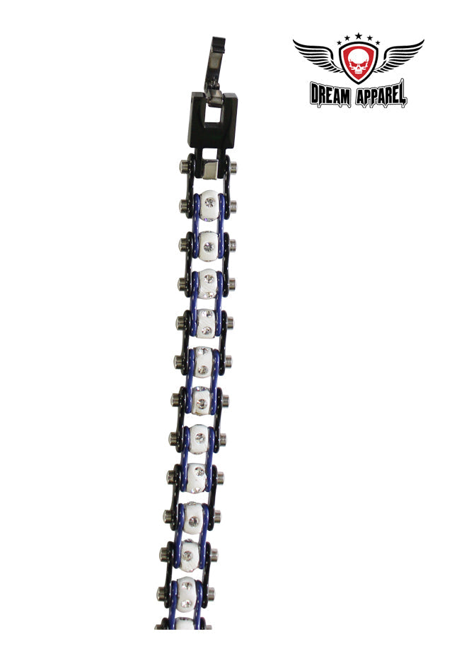 gemstones make up the interior of the bracelet while the outer plate is a black chrome followed by a blue. The heavy duty clasp makes sure the fit is perfect and very much adjustable. This amazing bracelet is yours to grab now, don't lose out on this oppurtunity.