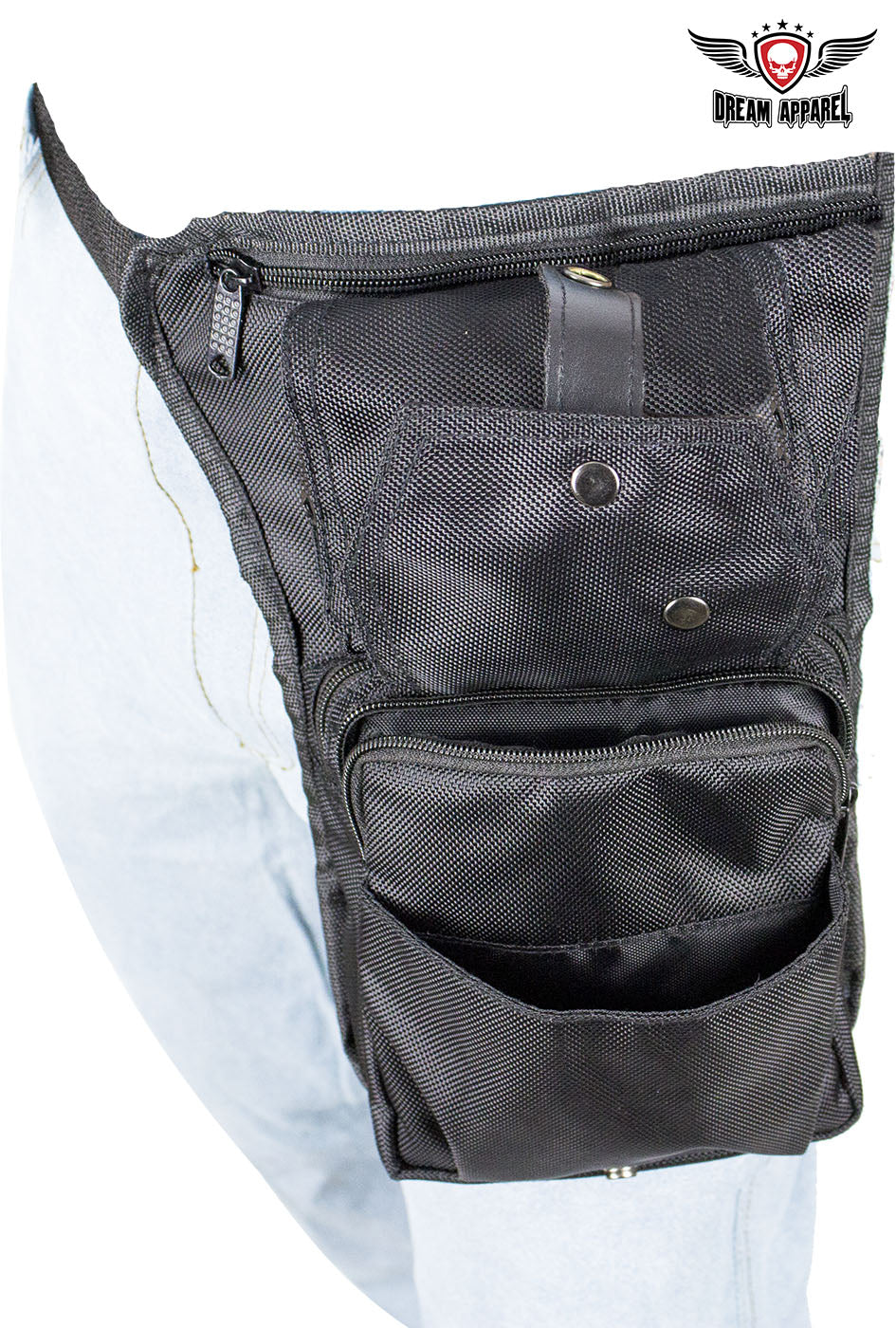 This durable, all-weather Black Textile Multi Pocket Thigh Bag with Gun Pocket features a large zippered gun pocket with a wide elastic strap. Measuring 11.75" x 8", it attaches easily to your belt and thigh. Additional storage is provided with a button snap flap that covers a zippered compartment and a slip pocket, another larger zippered compartment, an additional button snap flap that covers another zippered pocket and another slip pocket, and a zippered compartment on the back. If you're looking for a way to carry concealed with loads of room for everything else, then order yours now.