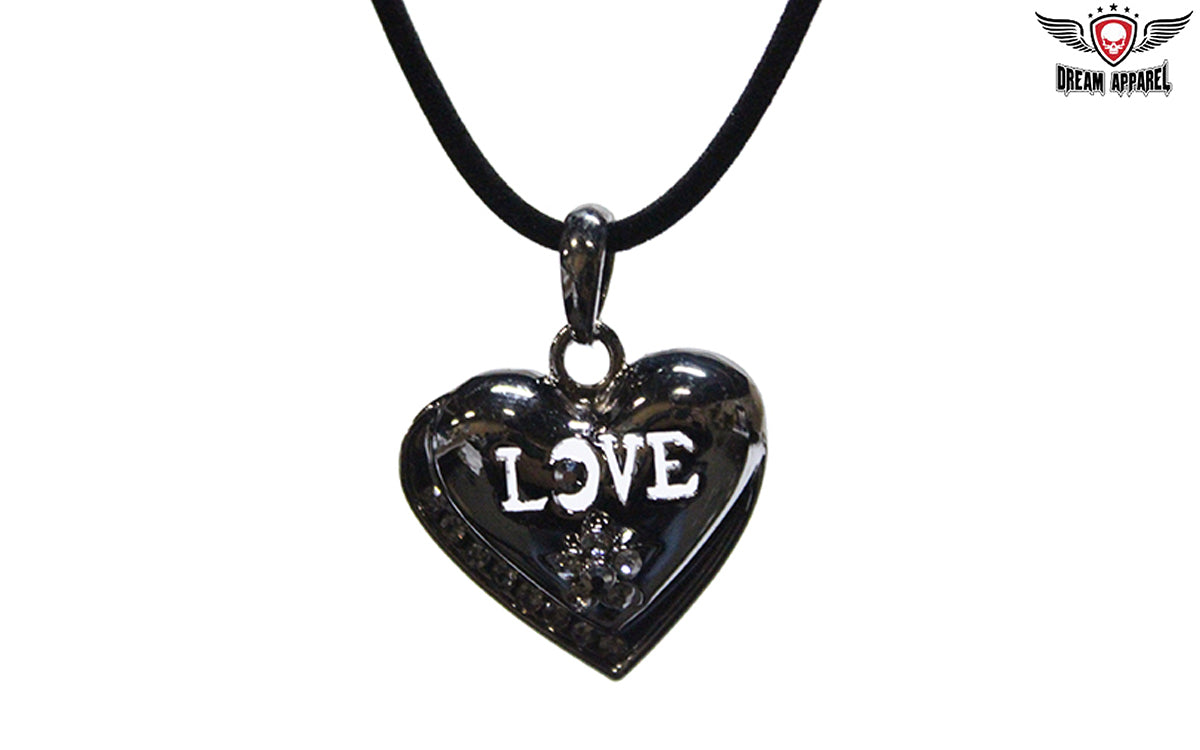 This delightful 1" heart-shaped pendent hanging from 20" of black velvet cord with a 2 1/4" extender makes a wonderful accessory for riding or an elegant night out. The silver heart has the words LOVE cut out and is fitted with gemstones on the edge and in a flower shape on front. Secured by a lobster claw clasp with a 2 1/4" extender, this terrific necklace is very popular and sells quickly.