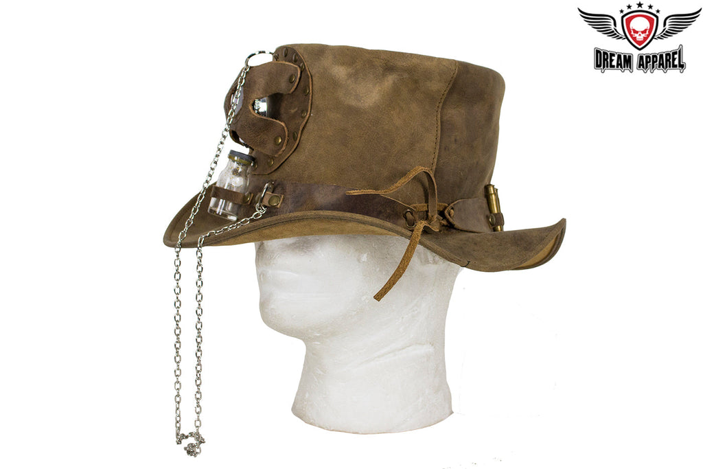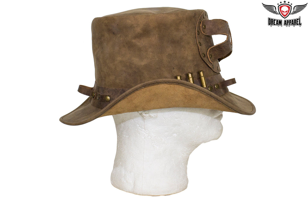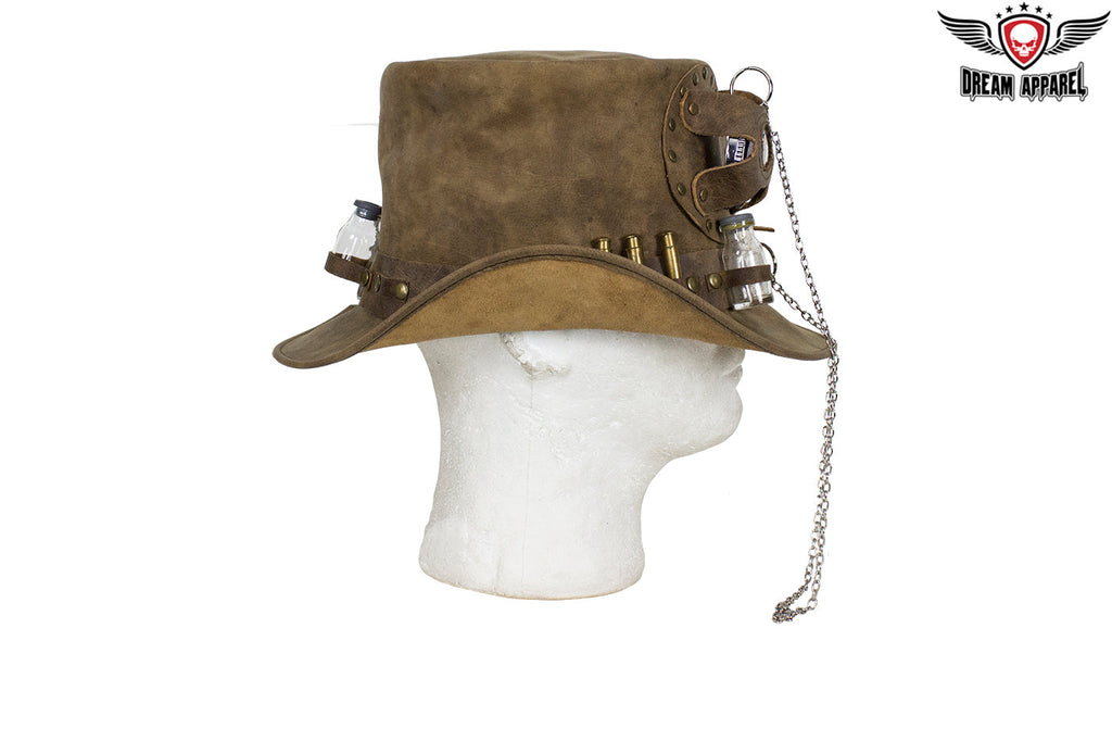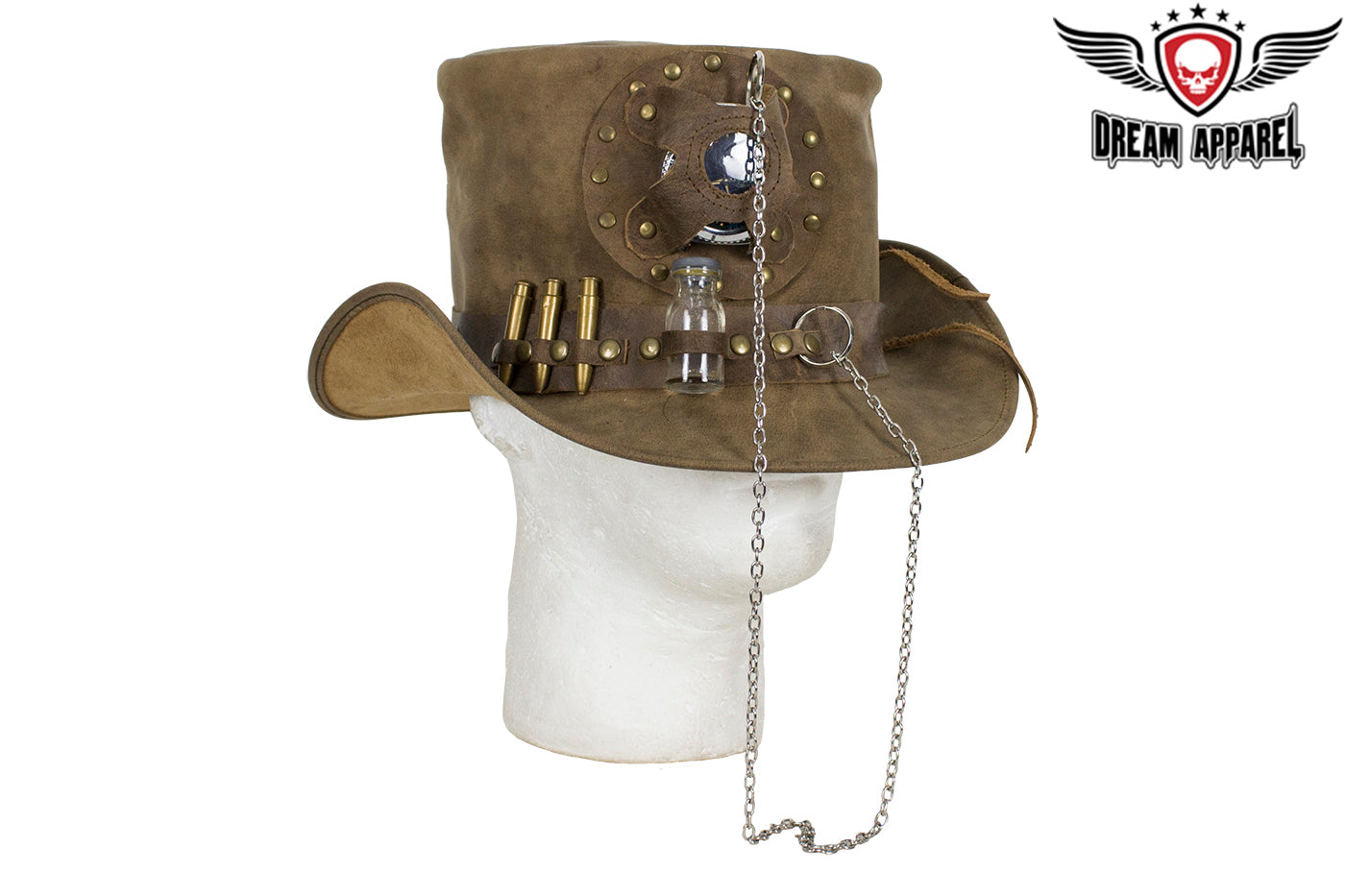 WOAH! We took our own spin on a classic and timeless look and came up with this beautiful brown deadman top hat. Made with genuine naked cowhide leather, the hat is definitely of the highest quality. One very unique thing is the brown hatband, which has straps for bottles and bullets. Another thing is the watch featured on the front with a polished chain. The brown leather laces are placed on the left side. Lastly the entirety of the hat has brass studs placed on it. This hat is a very good purchase so don't miss out, grab yours today.