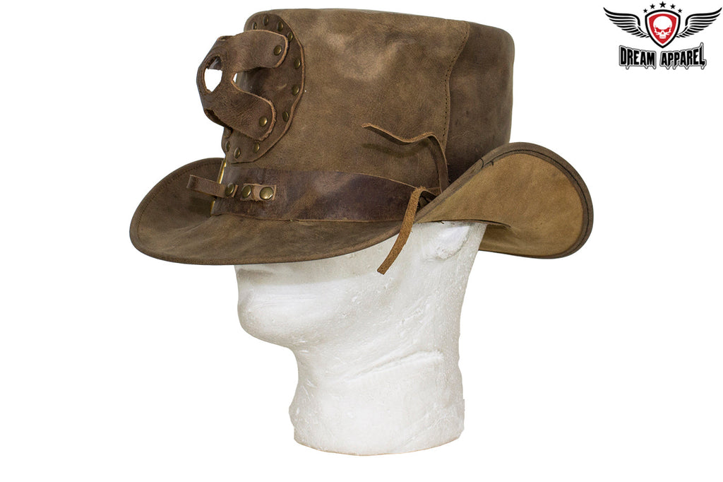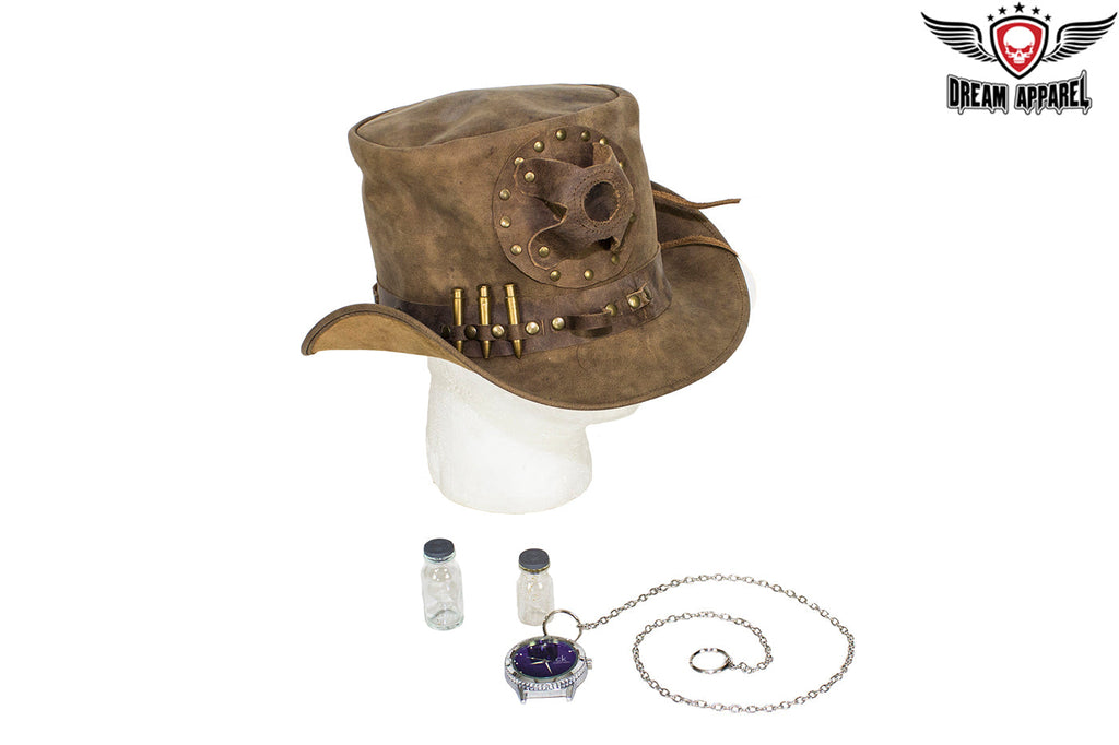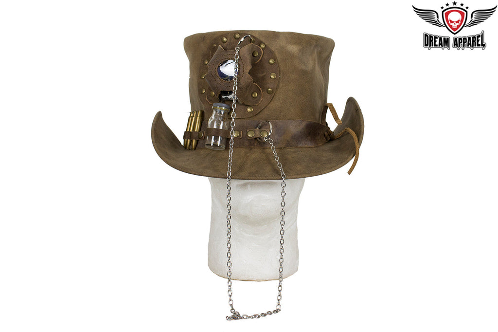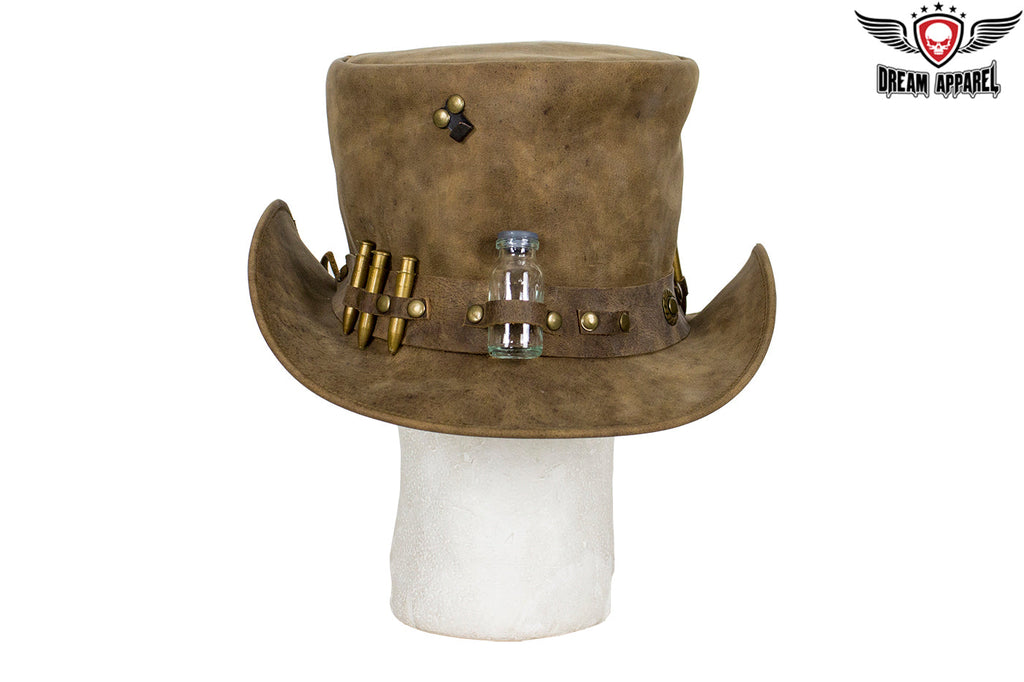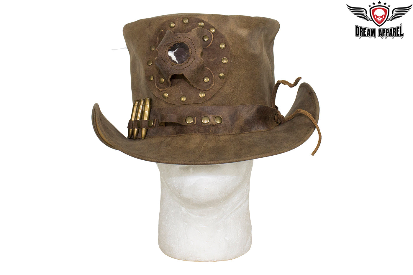 WOAH! We took our own spin on a classic and timeless look and came up with this beautiful brown deadman top hat. Made with genuine naked cowhide leather, the hat is definitely of the highest quality. One very unique thing is the brown hatband, which has straps for bottles and bullets. Another thing is the watch featured on the front with a polished chain. The brown leather laces are placed on the left side. Lastly the entirety of the hat has brass studs placed on it. This hat is a very good purchase so don't miss out, grab yours today.