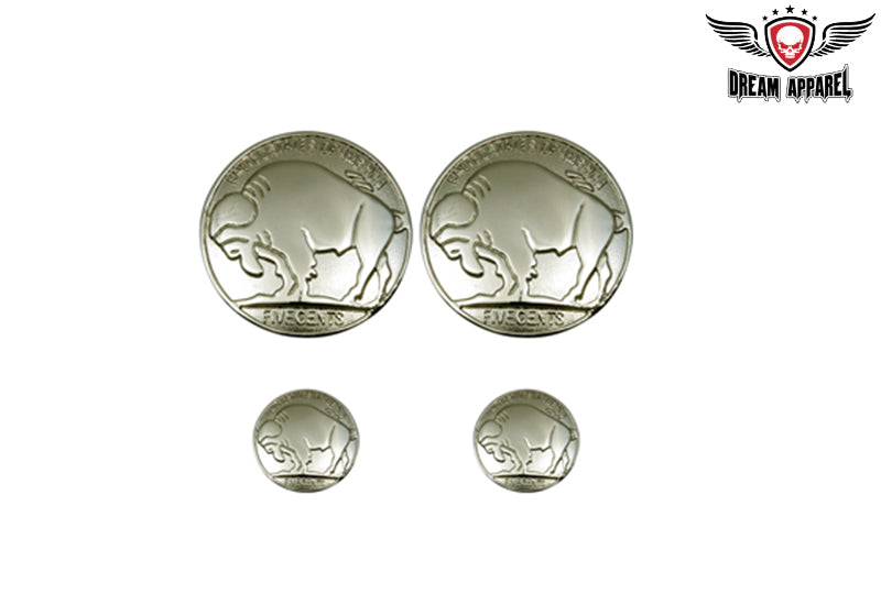 Buffalo Biker Pins made by Dream Apparel comes in a 4 pack, 2 Large pins and 2 small pins. The large pin’s height is 2” and the width is 2”. The small biker pin’s height is about 1” and the width is 1”. The larger Buffalo biker pins with pin lock can secure and customize your saddle bags, tool bags, sissy bar bag or any gear bags. You can also use our Buffalo biker pins as an accessory on your jackets, vests or shirts.