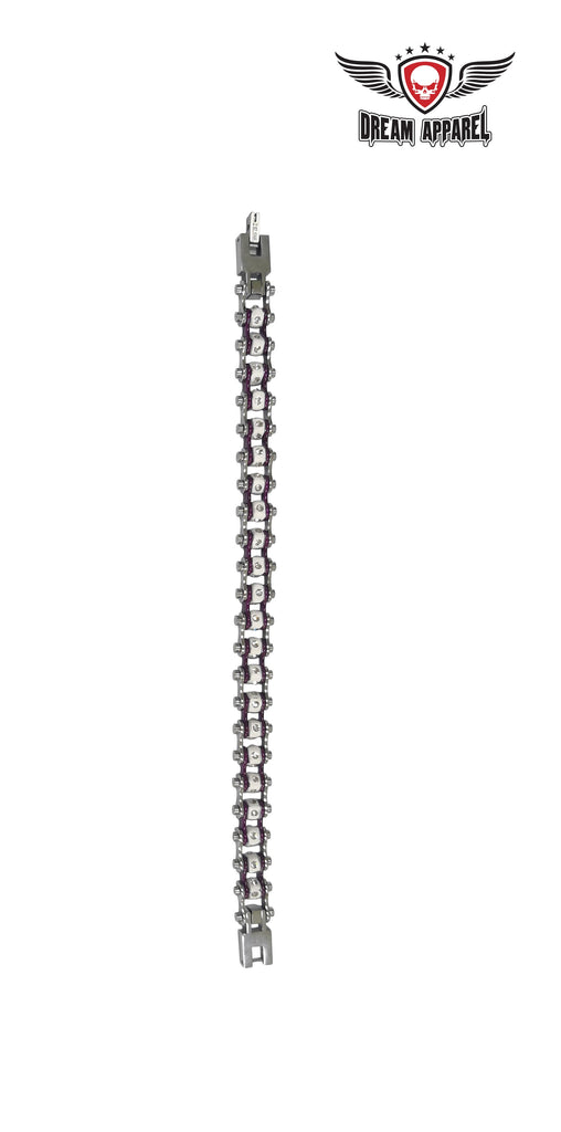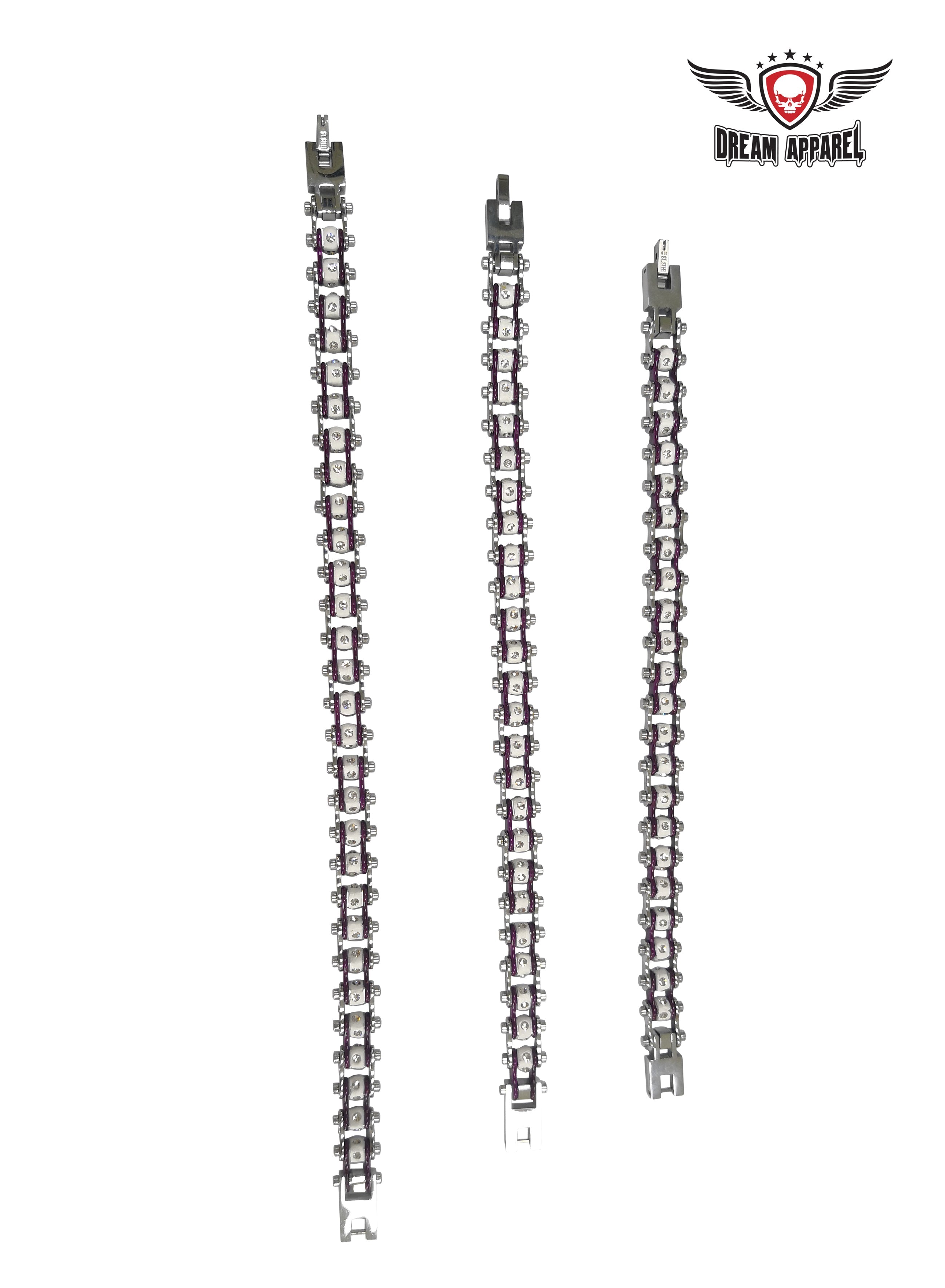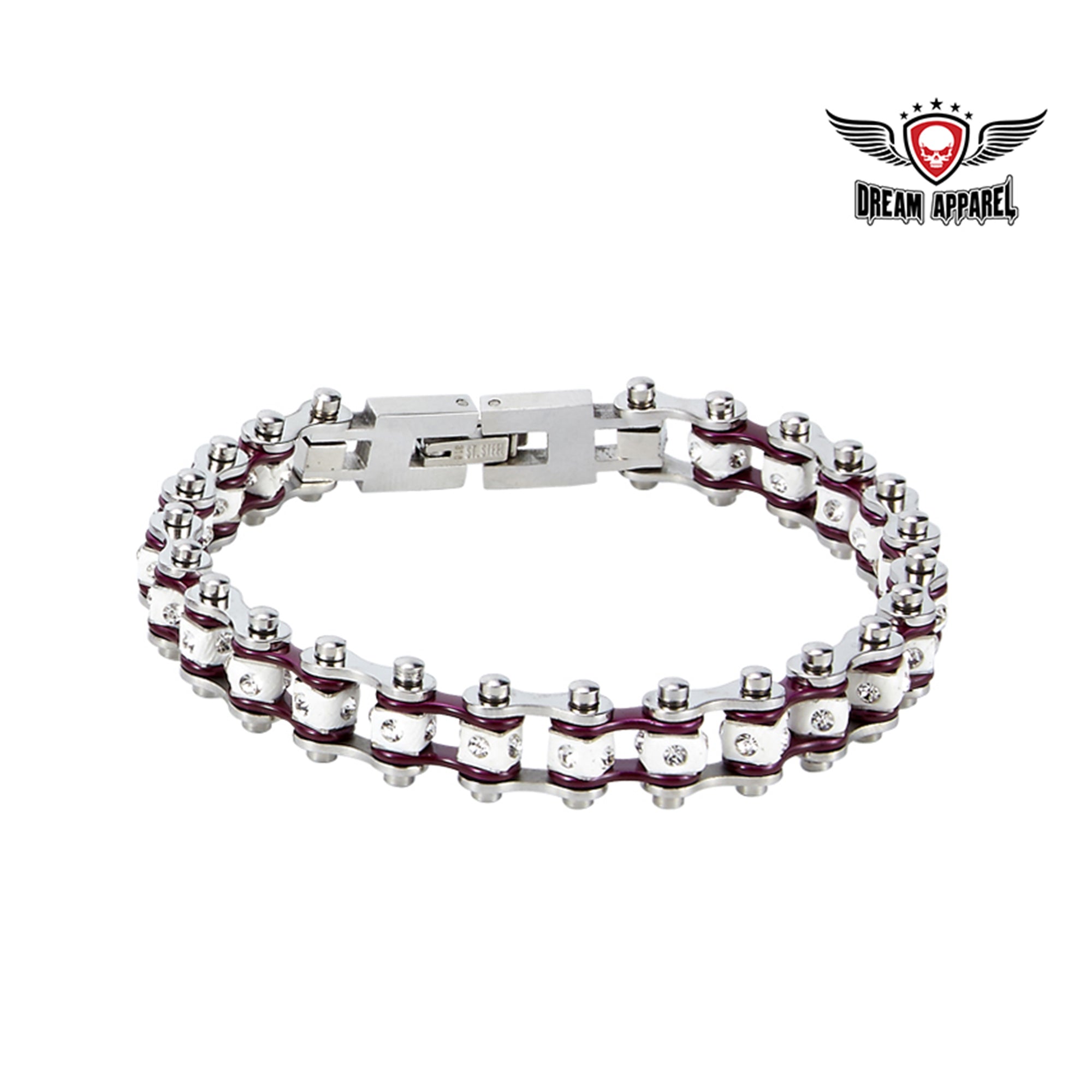 Beautiful white squares placed inside this chrome and purple motorcycle bracelet which features clear gemstones implanted on it. Each stone is perfectly placed, and stands out in a great fashion. The bracelet has a heavy duty chrtome clasp makingsure the fit is comfy and very much adjustable. This glamourous bracelet is truly a must have and we hope you take this oppurtunity to grab yours now!