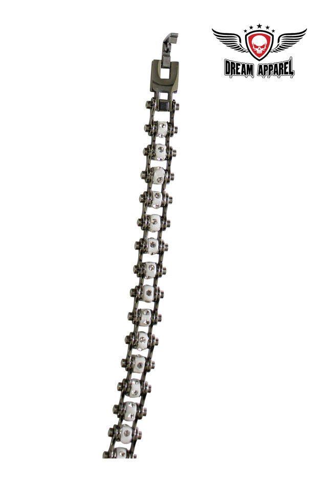 Another masterpiece in our arsonal, this beautiful chrome plated motorcycle bracelet features white squared rollers with attractively placed clear gemstones. The heavy duty chrome clasp is without a doubt the best possible way for fine adjustments to be made, but we wanted to make sure you recieved the ideal fit you've been looking for. Get the chance to grab yours now, don't miss out.
