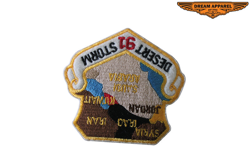 You and your brothers fought and died for the people of Kuwait. Let the memory of everyone's valor and sacrifice be remembered wearing our 2.75" x 3.00" Desert Storm patch. The bright and colorful map of the Middle East has the names of each participating country in gold above a white banner with the words DESERT STORM in black and 91 in red between them. Finally, the gold highlights make this popular military patches one of our best sellers. All of our handsome military patches are very popular among veterans so order yours today.