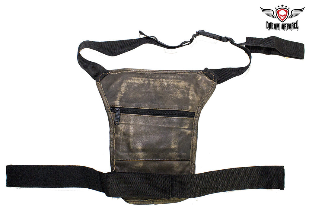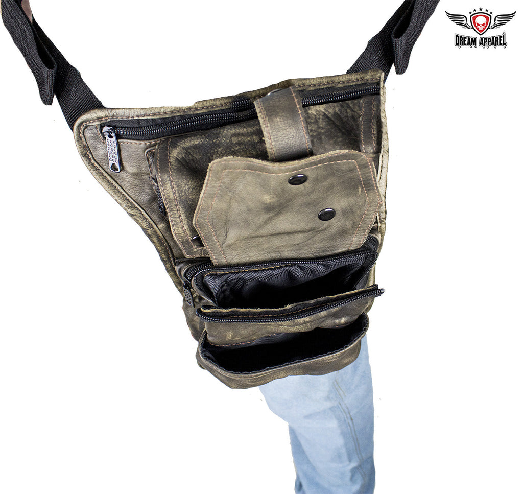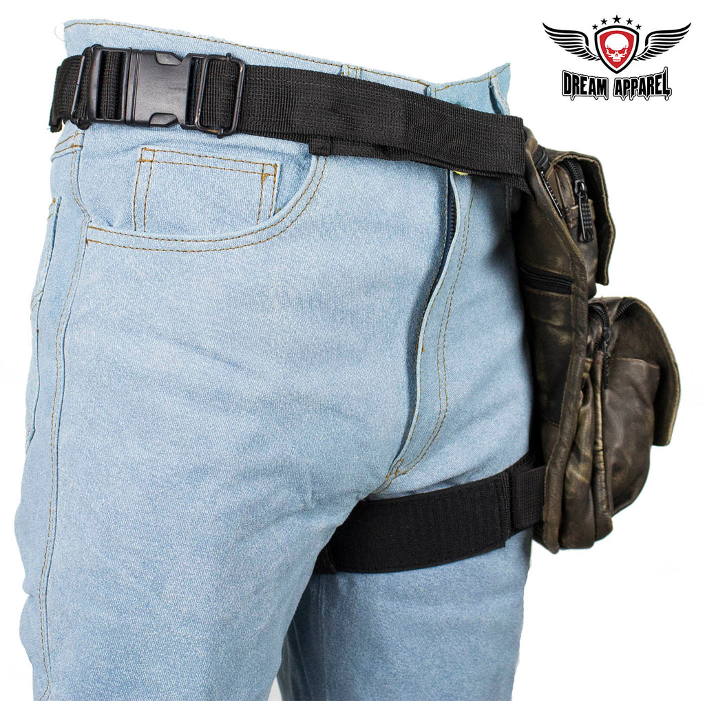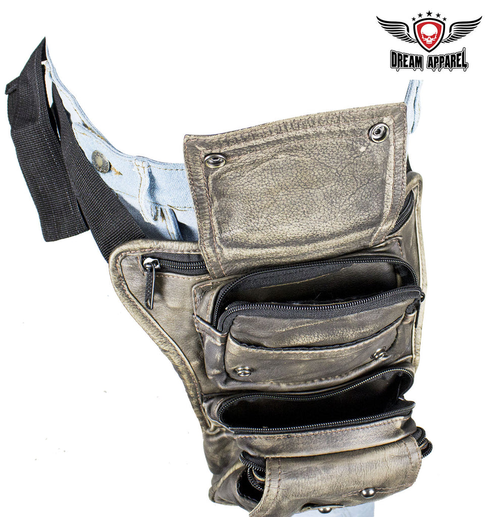 If you carry concealed and are looking for extra pockets without having to wear chaps, then our Distressed Brown Leather Multi Pocket Thigh Bag with Gun Pocket is just what you need. A thigh bag easily attaches to your belt and straps onto the thigh. Ours features a large zippered gun pocket with a wide elastic strap, a button snap flap that covers a zippered compartment and a slip pocket, another larger zippered compartment, an additional button snap flap that covers another zippered pocket and another slip pocket, and a zippered compartment on the back. You get all this room in a thigh bag that measures 11.75" x 8", making this amazing concealed carry thigh bag an incredible value.