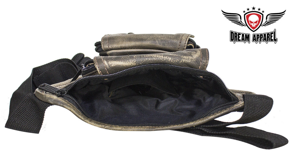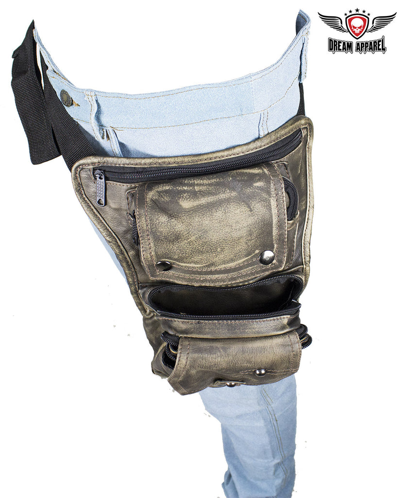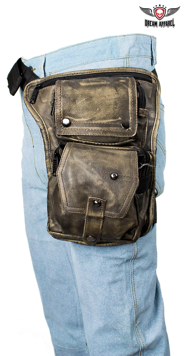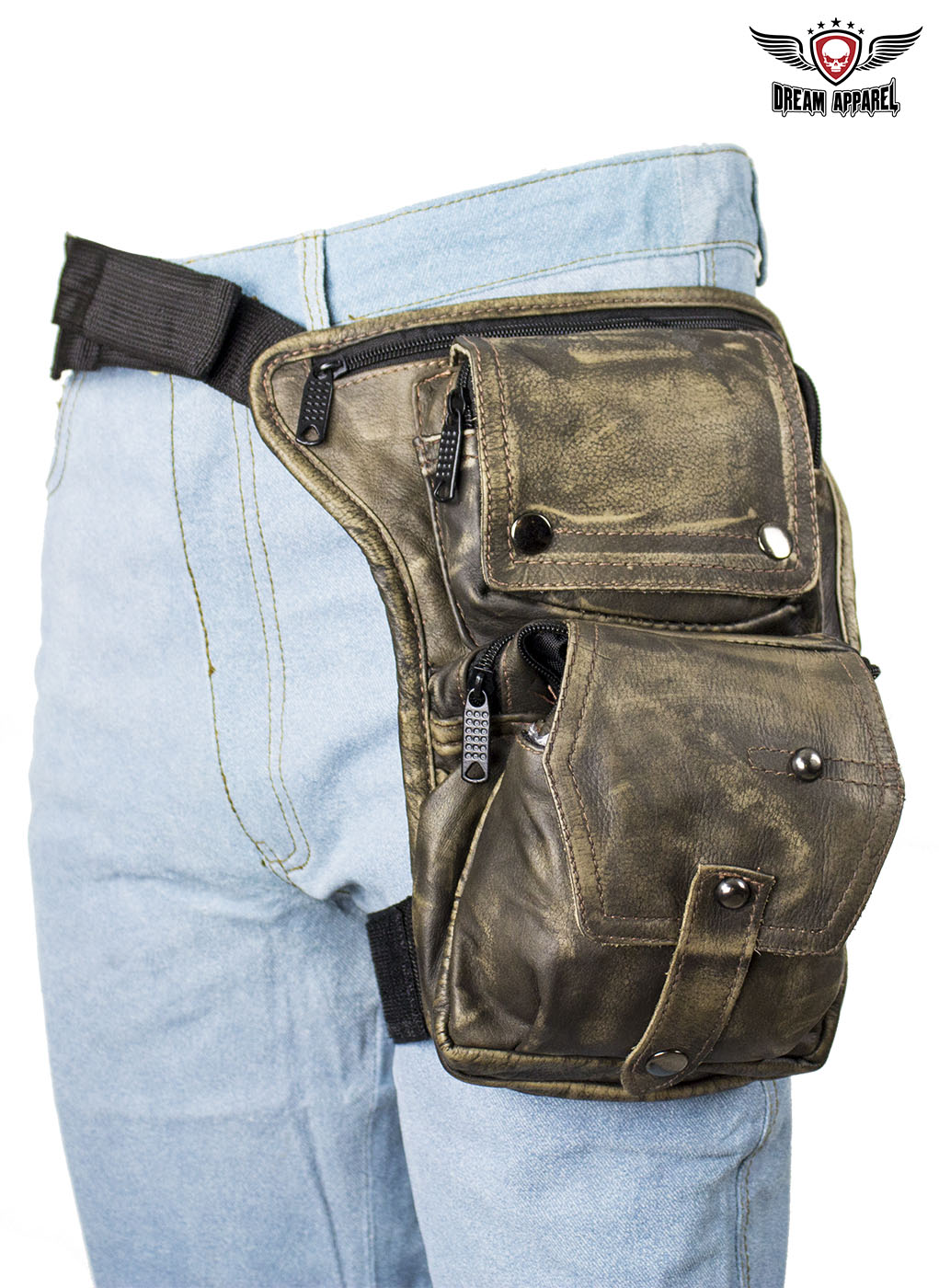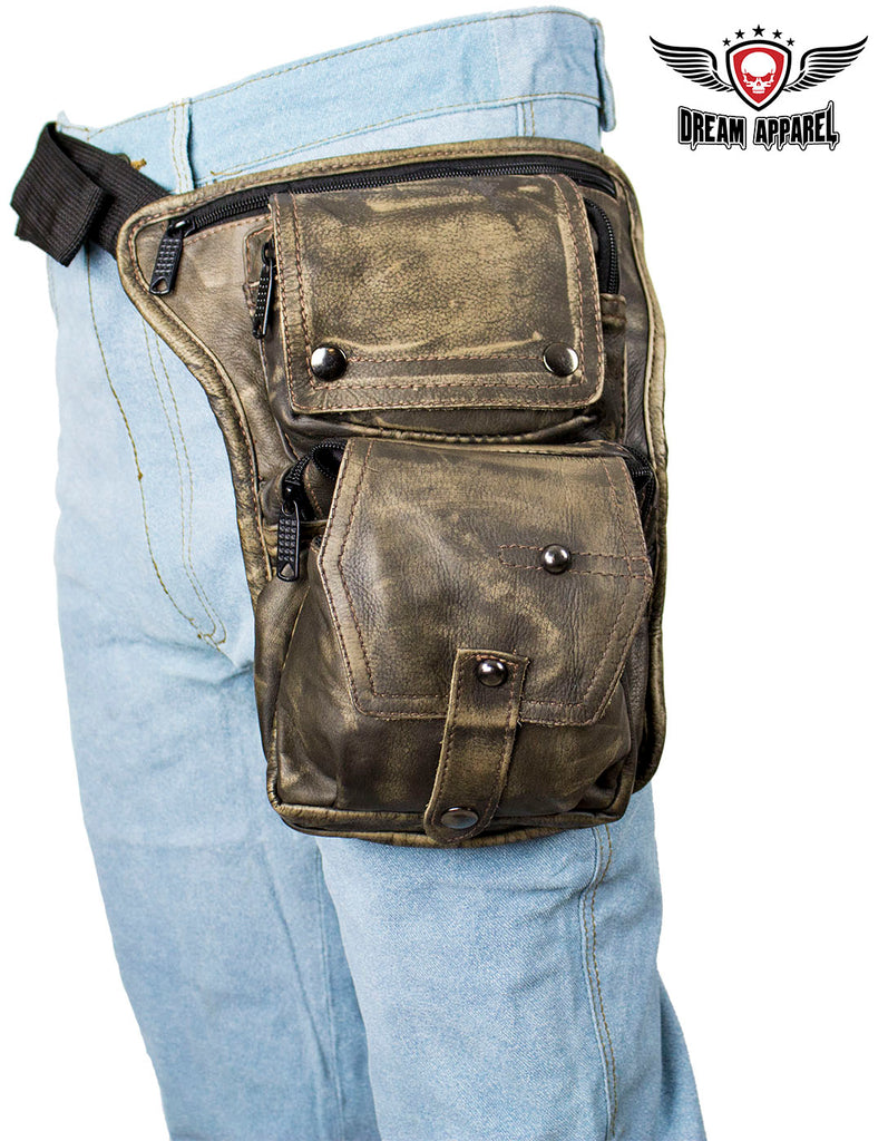 If you carry concealed and are looking for extra pockets without having to wear chaps, then our Distressed Brown Leather Multi Pocket Thigh Bag with Gun Pocket is just what you need. A thigh bag easily attaches to your belt and straps onto the thigh. Ours features a large zippered gun pocket with a wide elastic strap, a button snap flap that covers a zippered compartment and a slip pocket, another larger zippered compartment, an additional button snap flap that covers another zippered pocket and another slip pocket, and a zippered compartment on the back. You get all this room in a thigh bag that measures 11.75" x 8", making this amazing concealed carry thigh bag an incredible value.