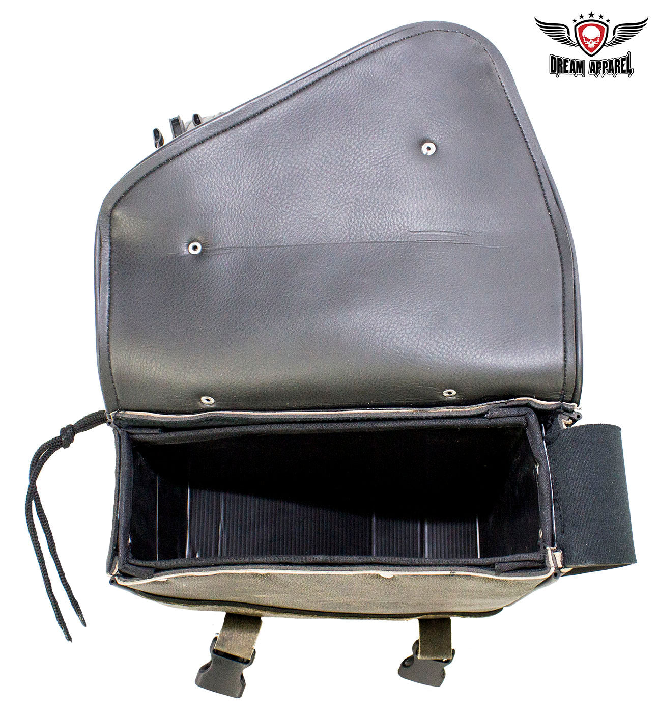 If you're looking for a genuine leather, right side swing arm bag for your Softail, Sportster, or Chopper then look no further. This incredible ag has all the features you need like an additional protective button-snap cover beneath the main flap for greater protection, attractive chrome studs around the opening, a hard sheet inside, decorative heavy duty quick releases, 3 chrome D-rings with black nylon laces to secure it to the frame, a heavy-duty abrasive resistant sheet on back, water resistant UV protection, and heat resistant material on the bottom of the bag. These bags are very popular and won't stay in inventory long so order yours now.