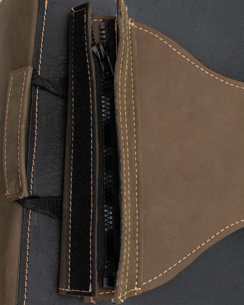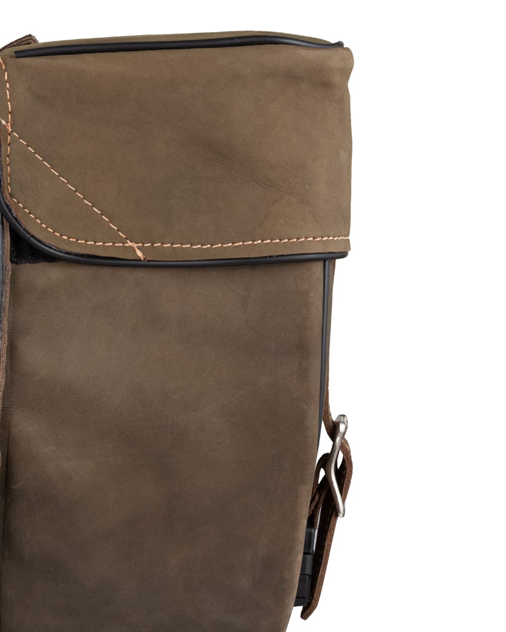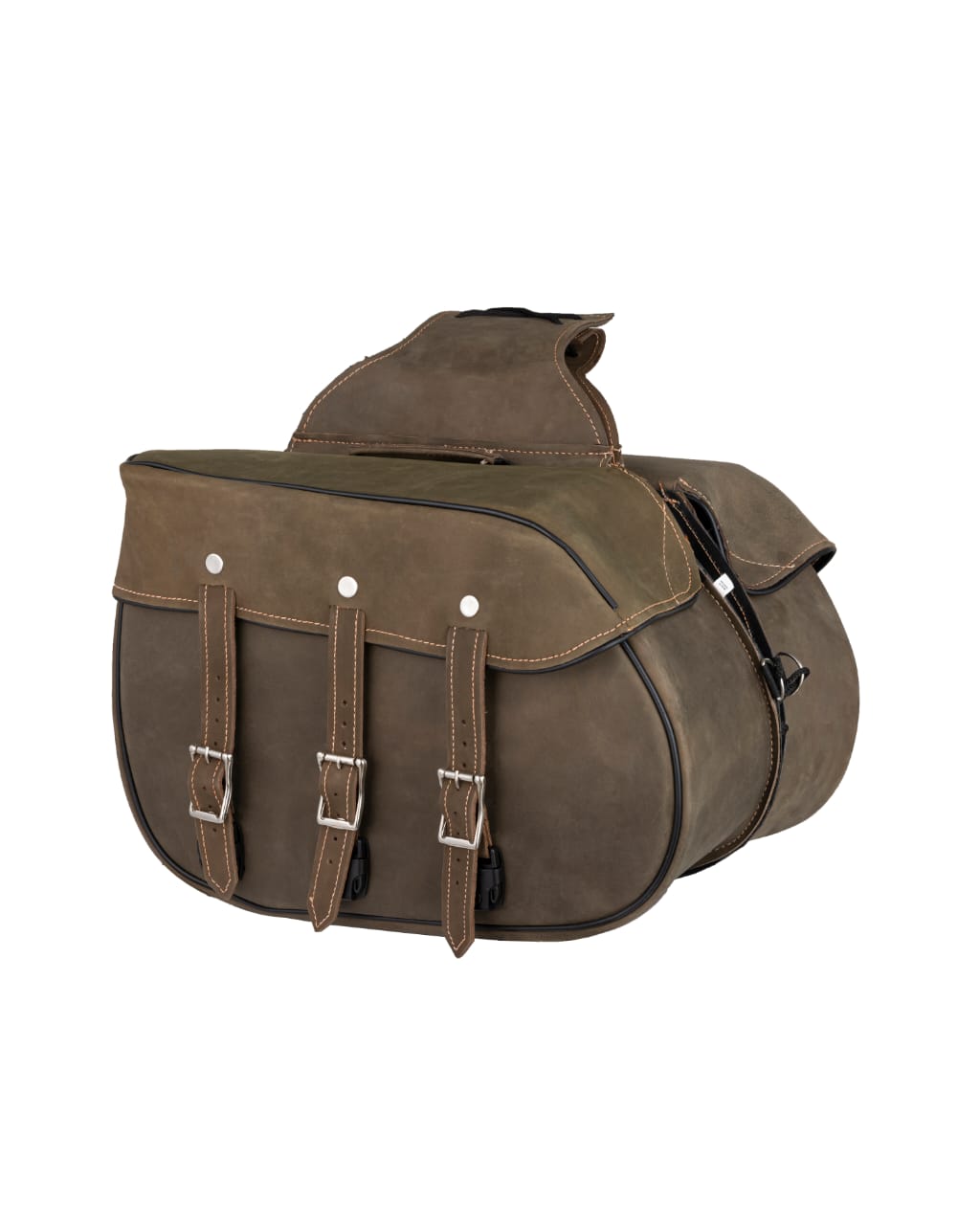 If you're looking to increase your cruising distance, then a bigger bike isn't the only thing you'll need. This 17.5"W x 6"D x 12"H vintage brown color, waterproof, naked cowhide leather is sewn around a hard shell and features elastic and adjustable strapping in each bag to secure your handguns, is water proof, guaranteed to hold its shape, and fits most motorcycles, Inside each bag is a nylon side pocket with an elastic band for smaller items. Everything is safe and secure by protective flaps over the openings with button snaps. The whole bag closes with an outer flap with heavy-duty quick release clips styled to look like vintage chrome roller buckles. Thin black braiding along the edges and chrome studs run along the braiding to provide a fantastic look. The bags tie together with flaps that go over the fender and tie together by nylon laces. For added support, they zip to the flaps by adjustable covered zippers and come with four tie down laces. Each bag comes with a strong carrying handle, is heat protected & road hazards protection. Order yours today as these incredible saddlebags offer an amazing value and are priced to move.