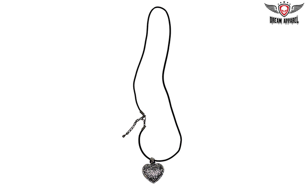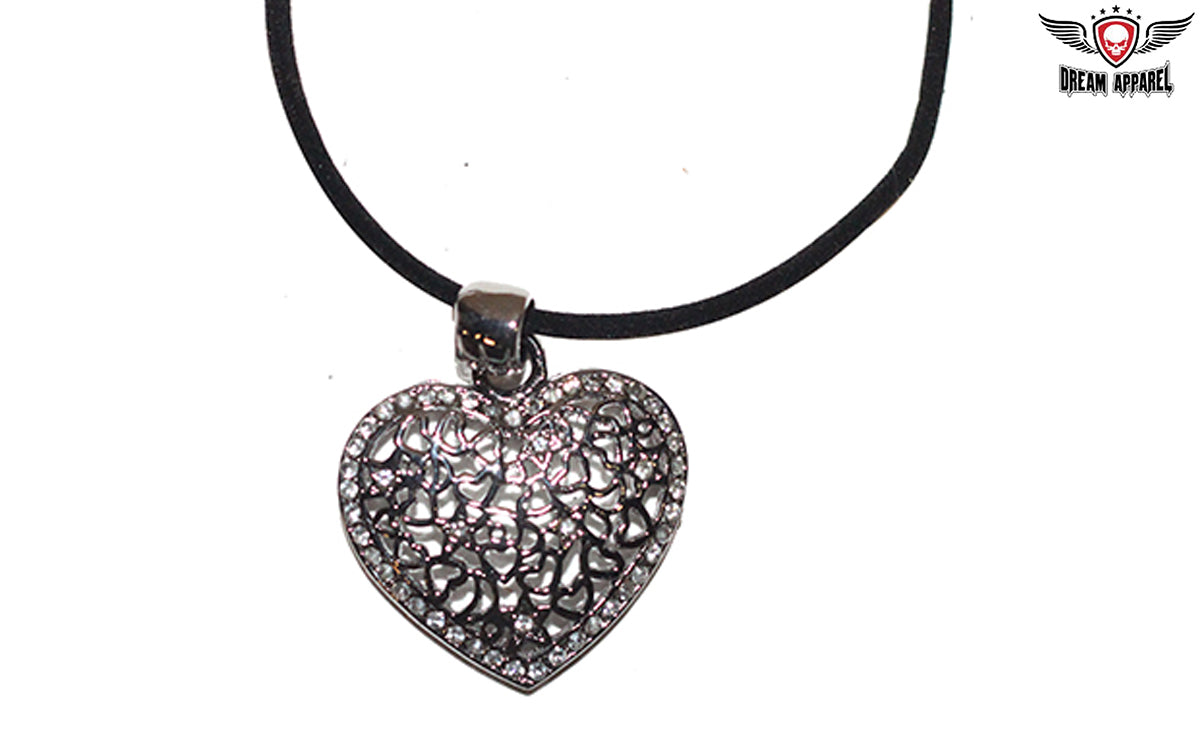 This captivating 1" x 1 1/2" heart-shaped pendent comes bordered with gemstones along the edge and is filled with tiny hearts, stars, and more gemstones. Hanging from 20" of black velvet cord with a 2 1/4" extender, this fantastic necklace can be worn on any occasion and secures with a lobster claw clasp and a 2 1/4"extender.