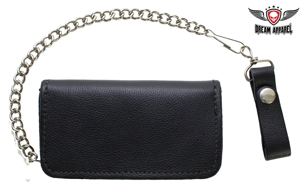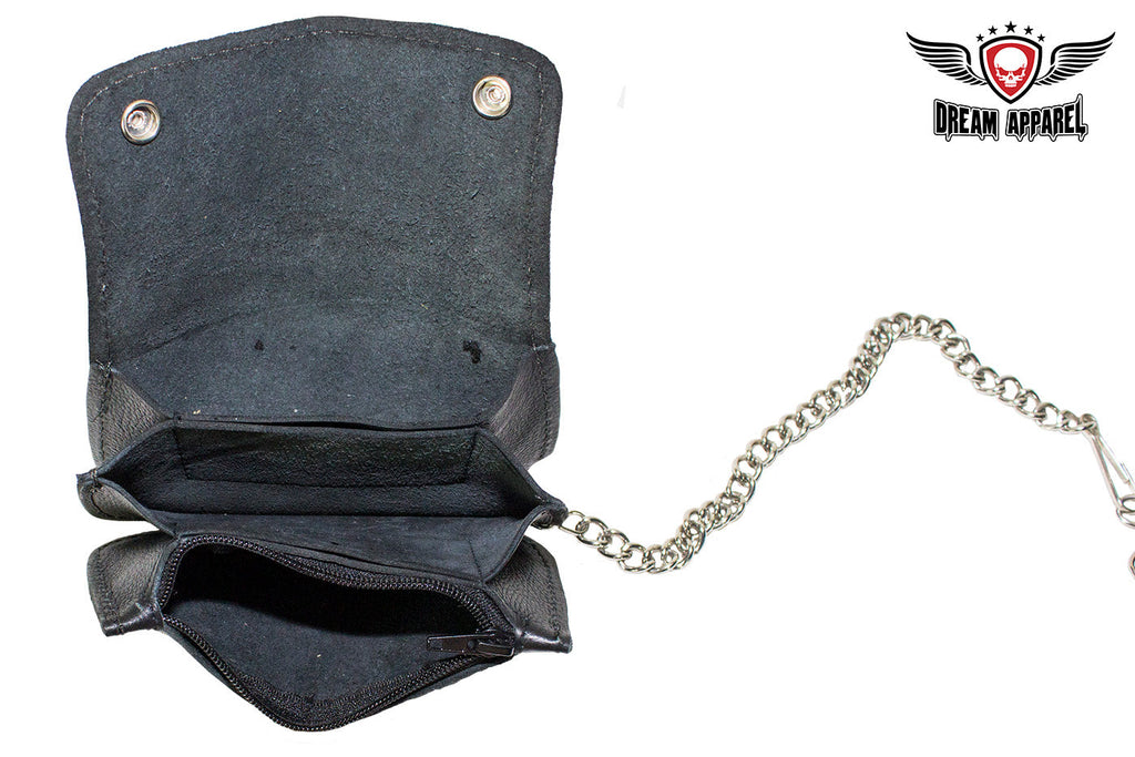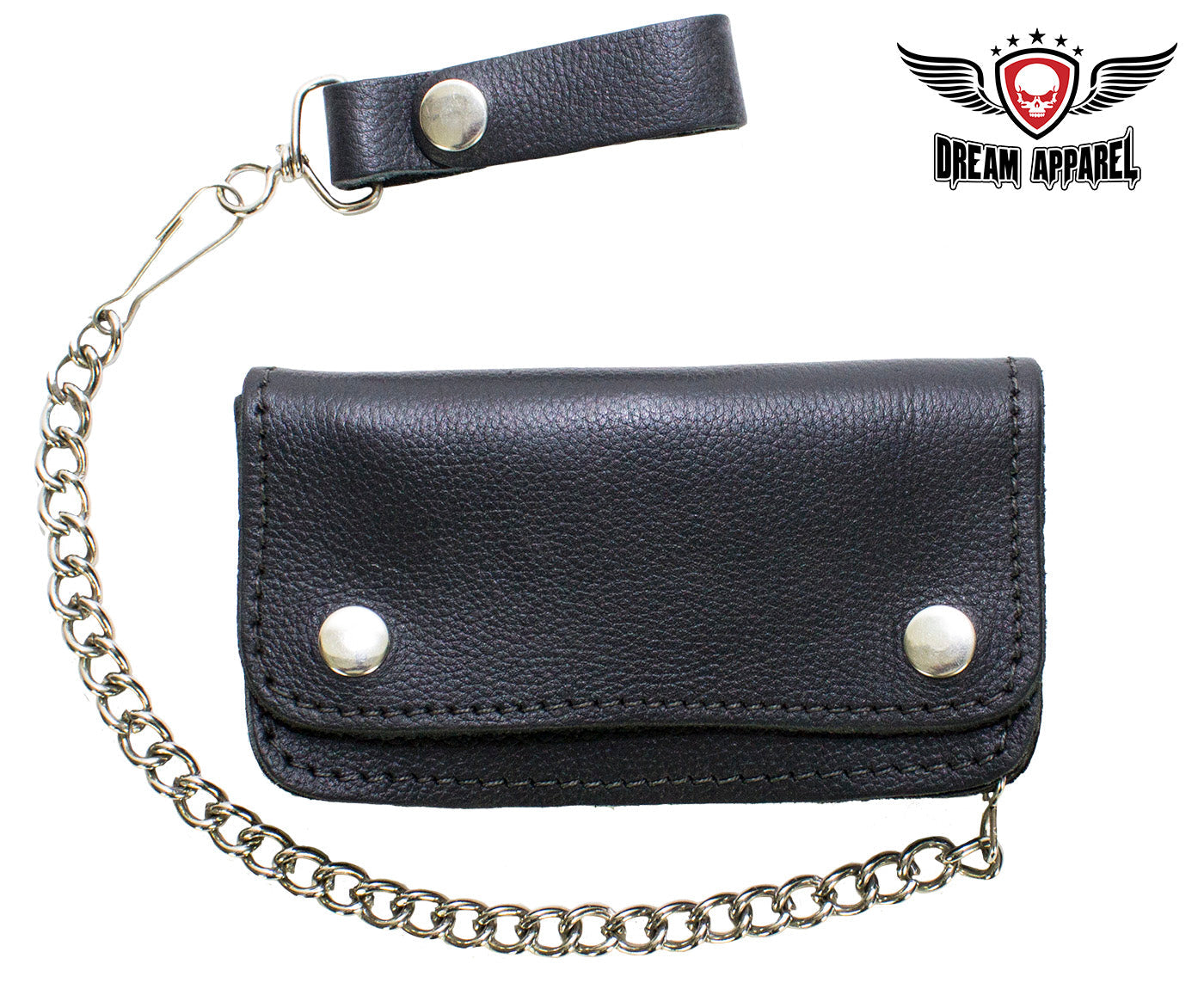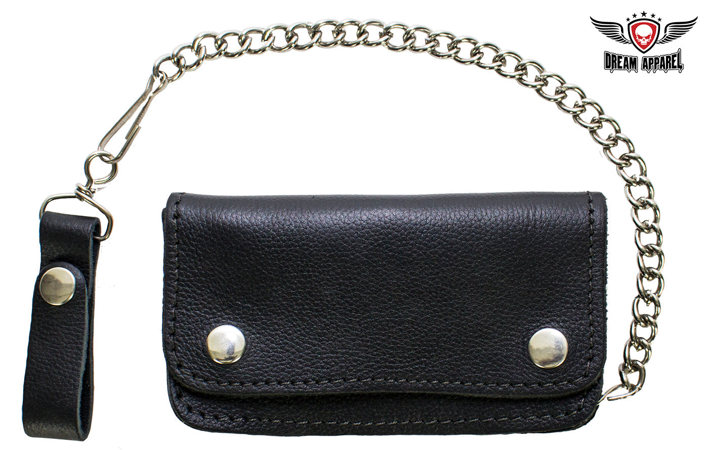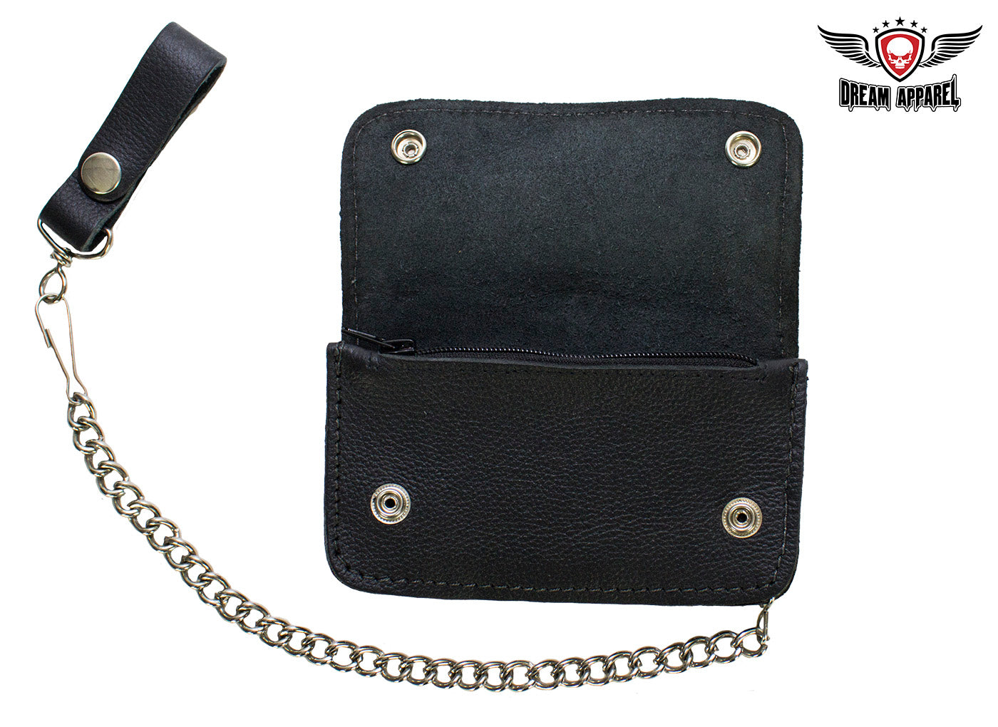 Dream Apparel's genuine black naked cowhide leather motorcycle chain wallets make an excellent and practical addition to your riding gear. Our wallets are made from heavy-duty, soft leather and feature three large compartments including one with a zippered closure for keys or coins and two smaller compartments for ID cards or credit cards. Perfected with double button-snap closures on the clover and a silver chain to attach to the button-snap leather belt strap, these terrific wallets won't stay in stock long so order yours now.