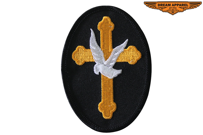 Share your faith with this 3.50" x 2.50" Holy Spirit and gold cross against a black background on an oval patch. Spread the love of Jesus wherever you ride.
