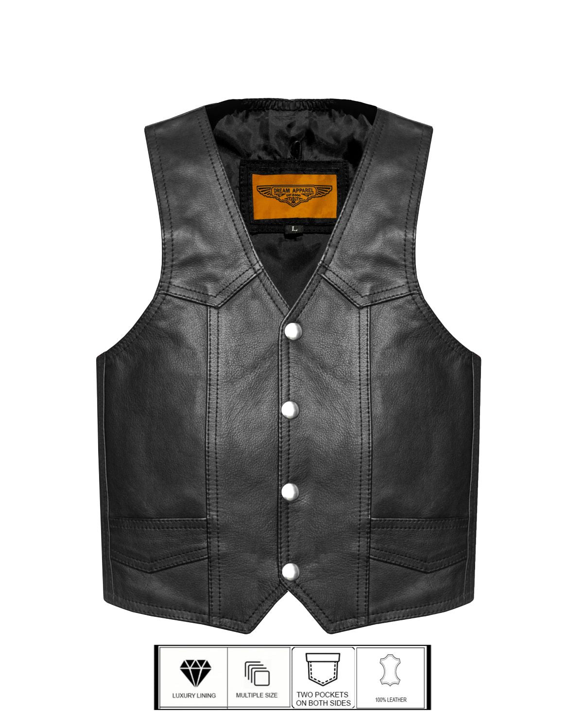 Trying to make a kid happier? Maybe he wants to look like "Daryl" from the walking dead. Dream Apparel presents the Kid's Plain Vest. You can customize it however you like, adding patches and embroideries. Boosting up confidence in kids, letting them feel like the little badasses they are. Crafted from top grade genuine leather, this great product feels great. People fall in love and end up wearing it all the time. Easy putting it on and taking it off with the snaps on the front. For the toys that someone might take, we have added pockets to hold everything in place. Everything needed to make someone's day and at a great low price!