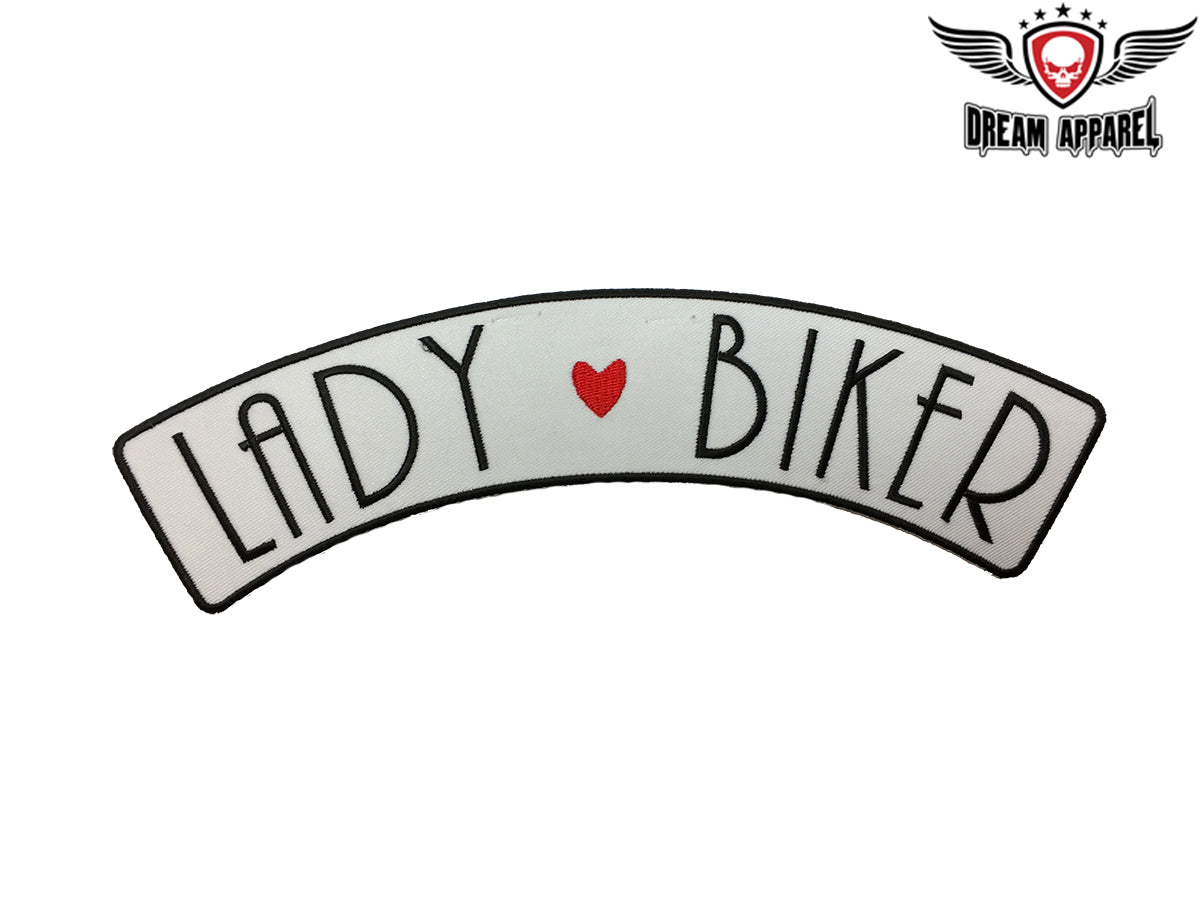 More women are riding now more than ever and ladies' motorcycle clubs are forming all around the world. This top rocker by Dream Apparel should be on all your vests and jackets. Measuring 2" X 9.75" with the words "LADY BIKER" in black across it separated by a simple red heart on a field of white with a black border, it's makes the perfect addition to your clubs' colors and other patches. Order yours today.