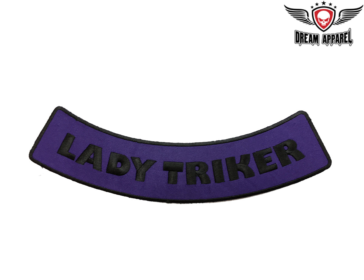 At Dream Apparel, we know more women are starting their own biker clubs and many of them are choosing trikes over conventional motorcycles. We've made this bottom rocker especially for you. This 2" X 9.75" bottom rocker has the words "LADY TRIKER" in black on a purple background with a black border. Order yours today.