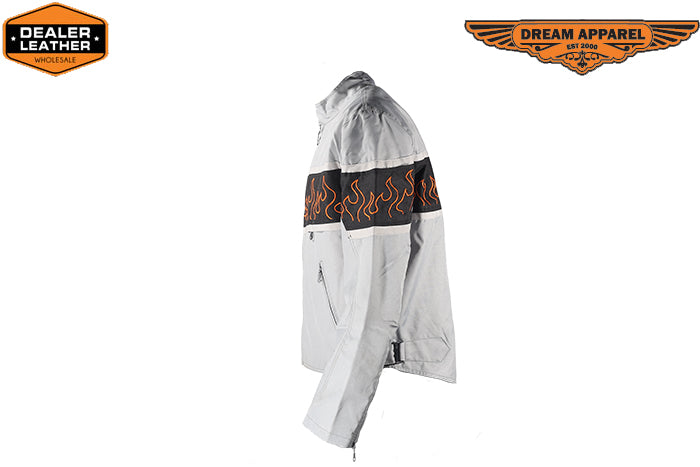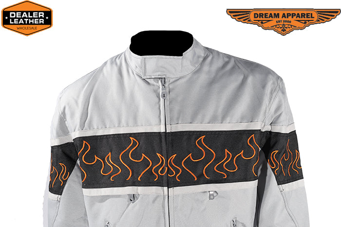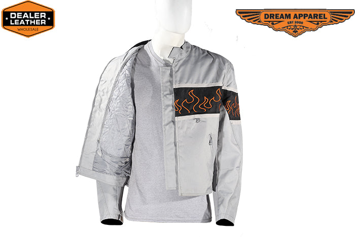 Unique styling has always been a part of us here at Dream Apparel and this light textile motorcycle jacket with a gorgeous flame design does just that. This jacket is a real masterpiece and when you wear it out, you'll definitely be the talk of the party. It features a zipout lining. It is snug fitting and not to bulky, which enables you to move around freely and not be uncomfortable. This jacket is for the ones ready to be the most stylish on and off the road.