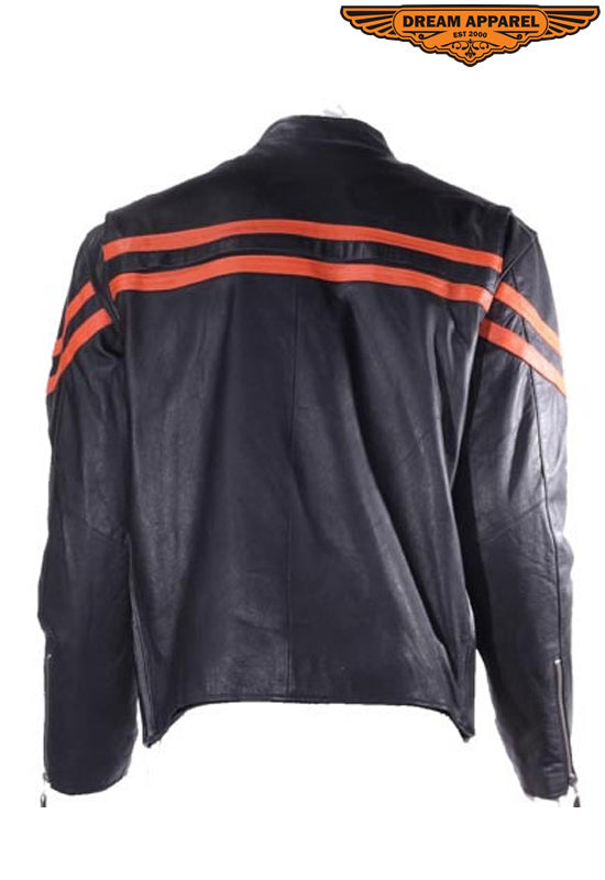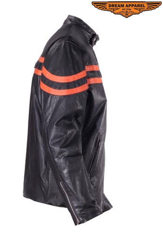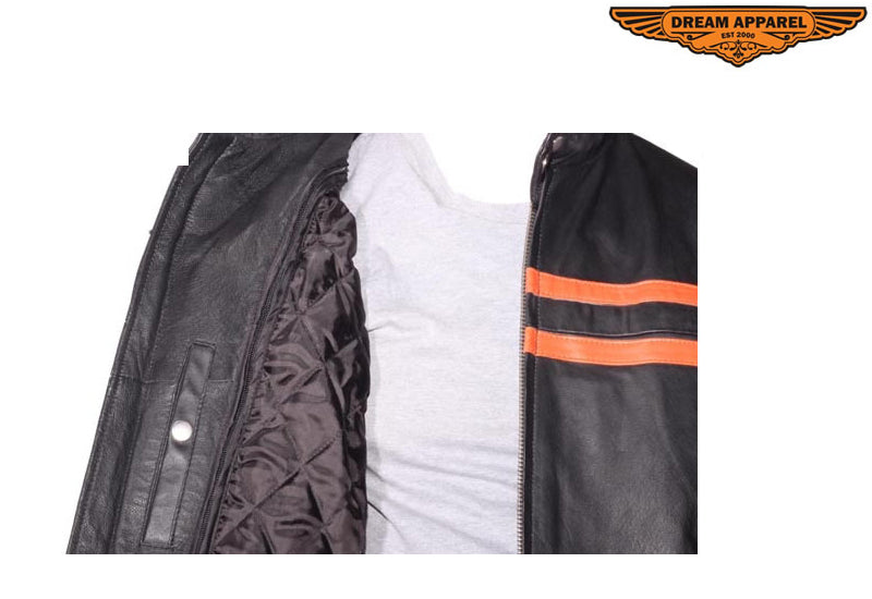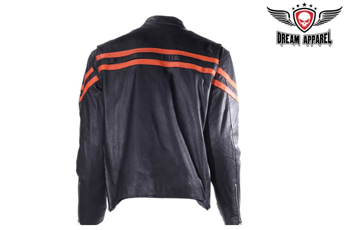 This beautiful split cowhide leather racer style jacket features dual orange racing stripes across the front and back. A perfect option if you're looking to stay comfortable while improving upon your style. Either way this is a great choice. You can't go rong with the multiple pockets that can be found on both the inside and outside of the jacket. Air vents are also available incase you're in need of increased ventilation. Two can be found in the front and the last on the back, The zip out lining is very comfy and runs through the sleeves. The vertical gathered sides are included in order for you to find the best possible fit. A neck warmer is also included for better winters! Grab yours today fellas and enjoy.