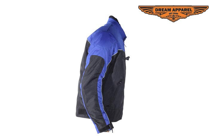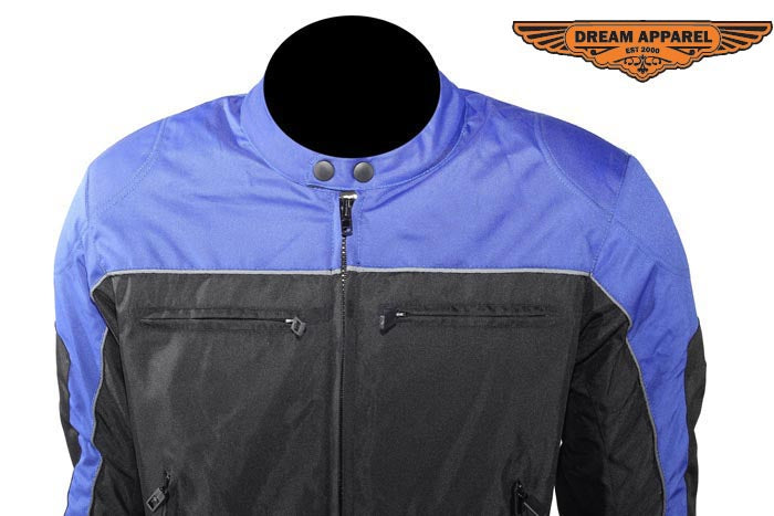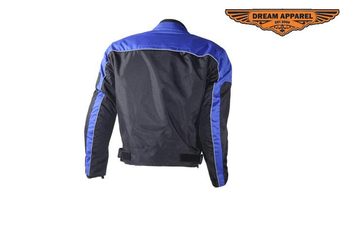 Men's jacket sporting a black and blue colorway features a Z/o lining, removable Certified Armor on the back, shoulders, and elbows, a reflective stripe for safer riding at night, multiple pockets, and velcro adjustments on the waist and cuffs for maximum fitting.