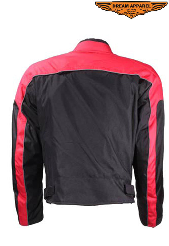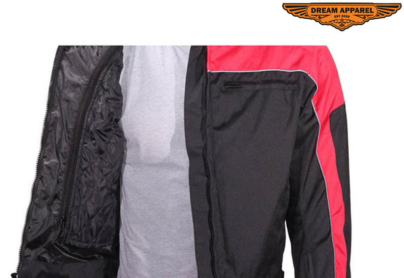 Great men's jacket sporting a black and red colorway features a Z/o lining, removable Certified Armor on the back, shoulders, and elbows, a reflective stripe for safer riding at night, multiple pockets, and velcro adjustments on the waist and cuffs for maximum fitting.