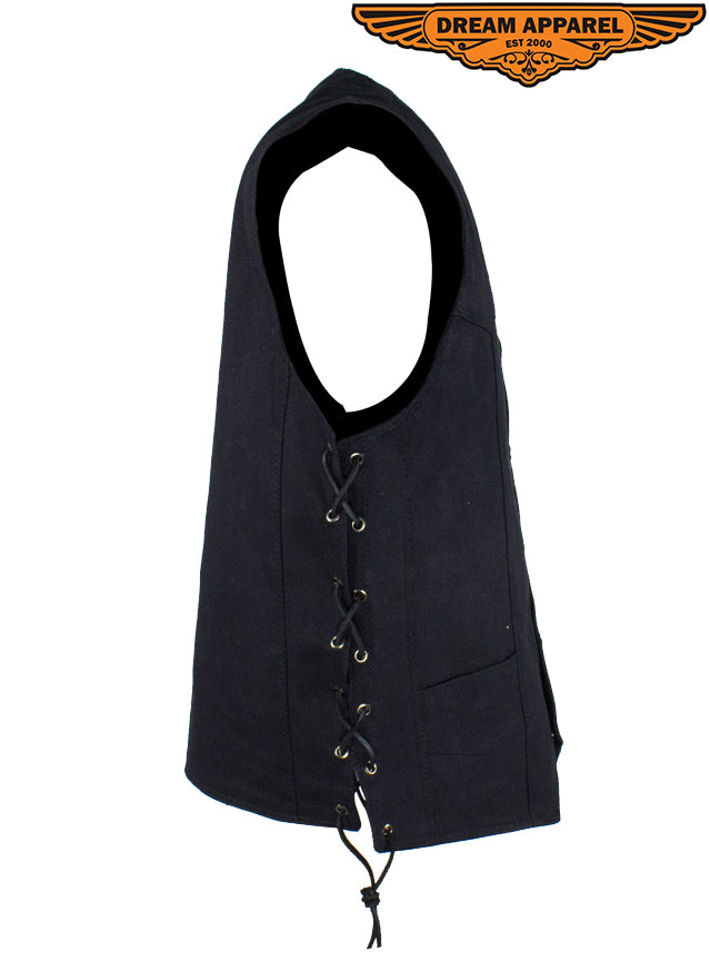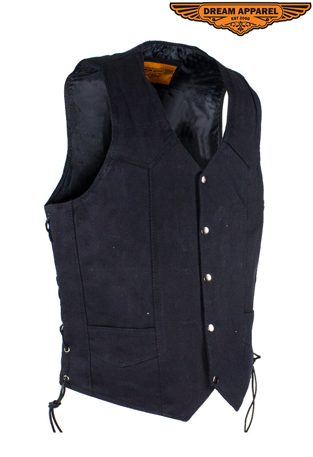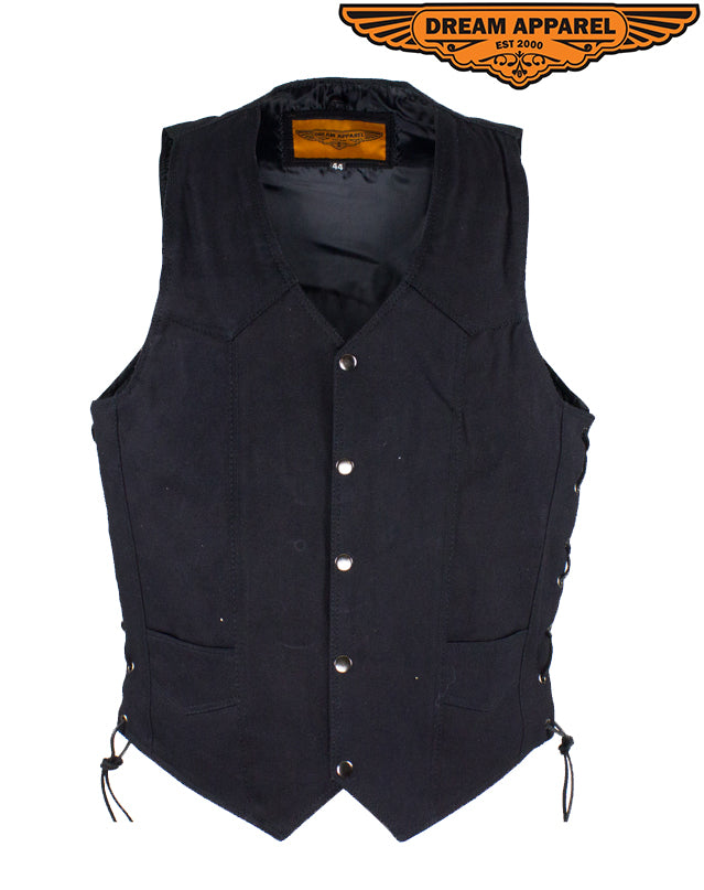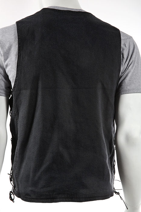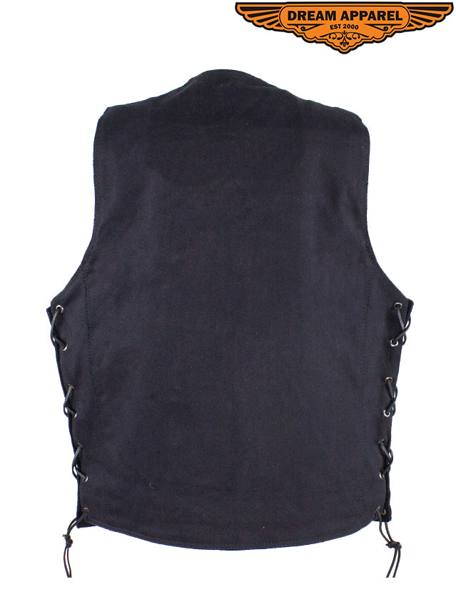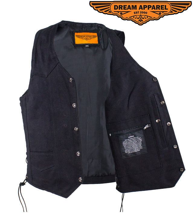 Black denim vests have never seen quality this amazing before. From the slick black color to its outstandingly amazing material, you get more than you'd pay for. With an interior that is lined for comfort to the side straps to adjust yourself, you'll fit in with ease. All it takes is 4 snaps and you close the vest. When you open it up, you will find a gun pocket to hold your toy including a nozzle strap to keep everything in place. Including that pocket, we have set multiple pockets inside and on the front panel of the vest. Dream Apparel put together a piece that makes people feel fully like themselves and comfortable as can be.