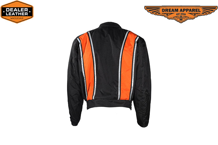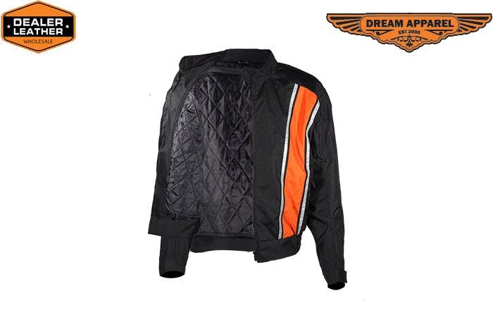 Unique styling has always been a part of us here at Dream Apparel and this light textile motorcycle jacket with a beautiful orange stripe design does just that. This jacket is a real masterpiece and when you wear it out, you'll definitely be the talk of the party. It features a zipout lining. It is snug fitting and not to bulky, which enables you to move around freely and not be uncomfortable. This jacket is for the ones ready to be the most stylish on and off the road.