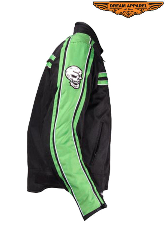 Mesh and nylon come together in making this fine piece. The black textile jacket features Green strips across the chest and down arms followed by white piping. A beautiful skull design is put on both arms making this jacket even more appealing. The lightweight aspect of the jacket makes it an comfortable and easy-to-throw-on type of look. Throughout the jacket, multiple pockets can be found allowing you to have a huge selection of storage options. The zipout lining also adds a comforability aspect to the piece. Zippered cuffs are also part of the jacket, which gives you the chance to adjust the fit to your liking. The foam based certified armor is placed on the elbows, back, and shoulders and is removable which will only make the jacket even lighter. Lastly, you are given reflective strips on the front and back which make sure you ride safe at night. This is a must have for every biker so don't miss out!