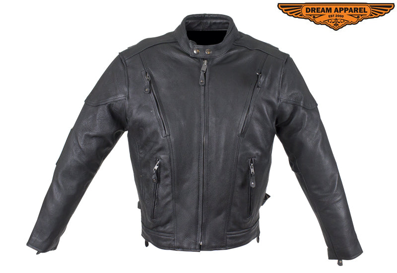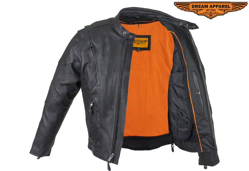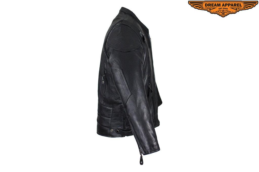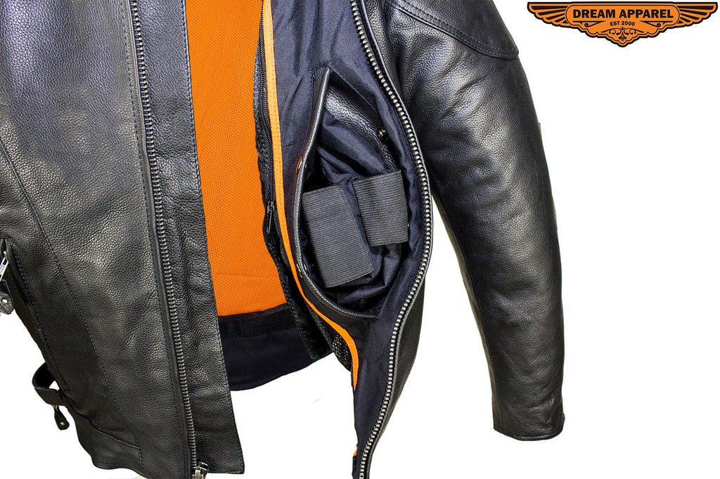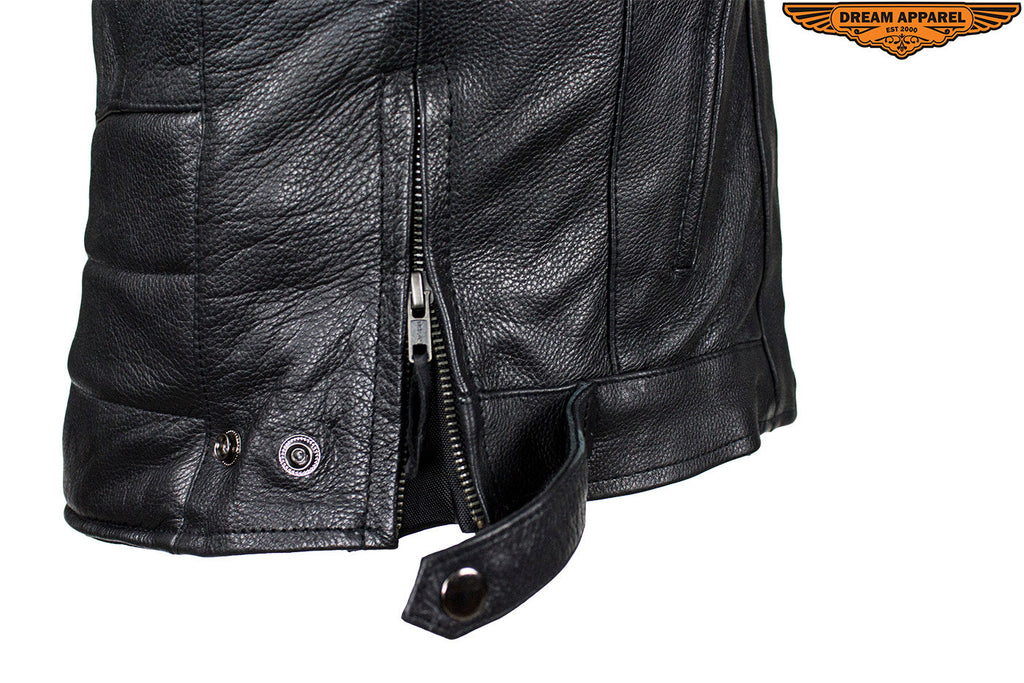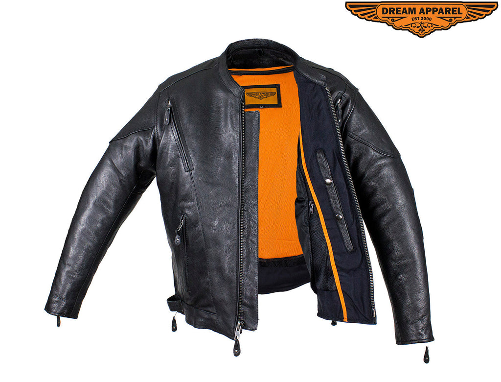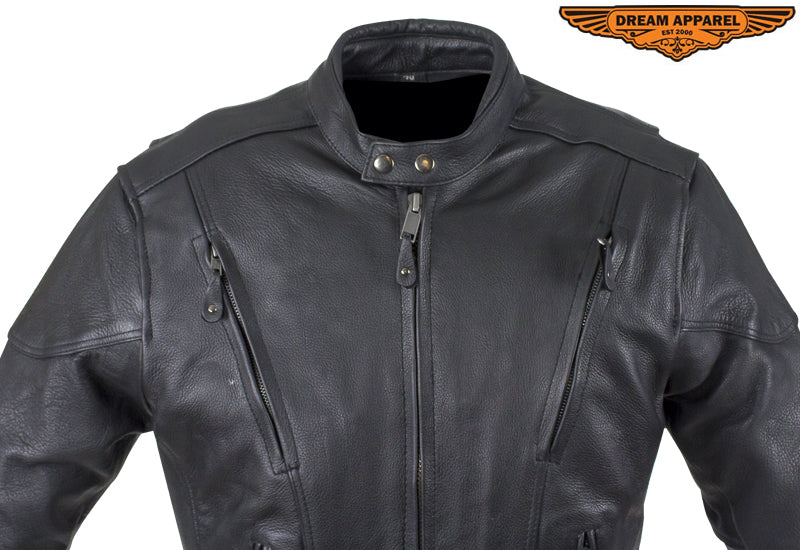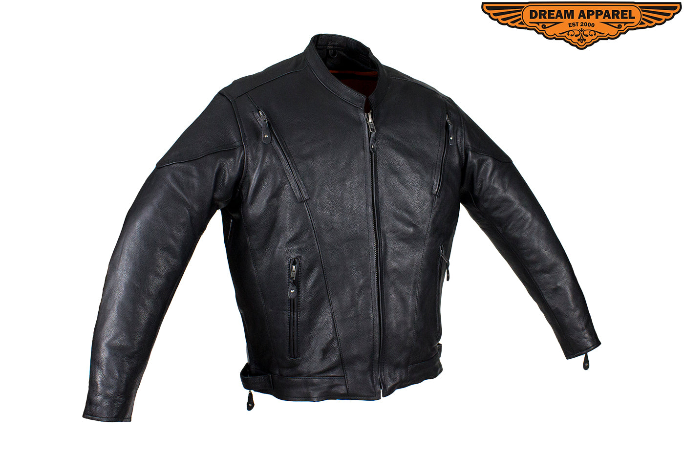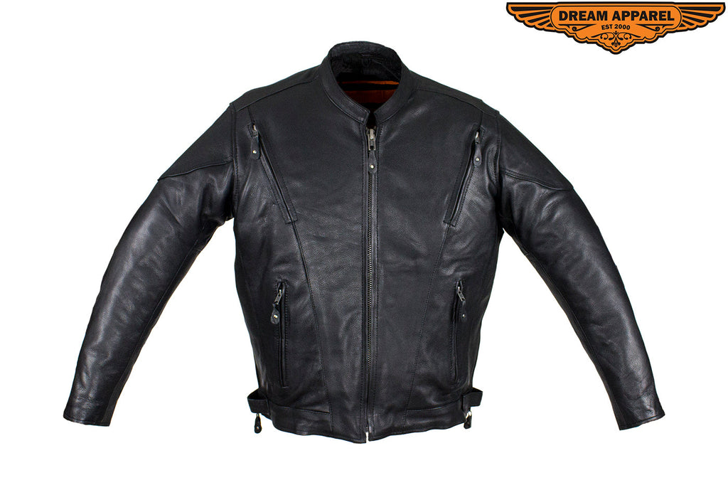 Full throttle motorcycle riders have a need for speed, the race track or that favorite back road you have to be smart and suite up right. Dream Apparels Racer Leather Jacket is designed for the toughest of riders, Heavy Duty Cowhide Leather and multiple air vents with zipper closure for comfort when the asphalt gets hot. Sleek collar with button snaps, front zipper closure, zipper cuffs, side zippers with button snap straps and lower back padding make this jacket extremely functional. Two front pockets with zipper closure and two inside pockets with snap closure hold various items safely so you can keep your eyes on the checker flag. Open this jacket up to mesh lined and a full sleeve zip-out liner for desired comfort in temperature fluctuations, great for cold weather or a summer cruising, you will be prepared for the road ahead.