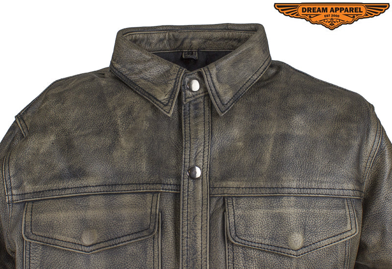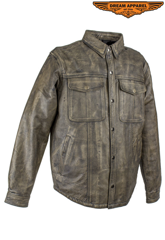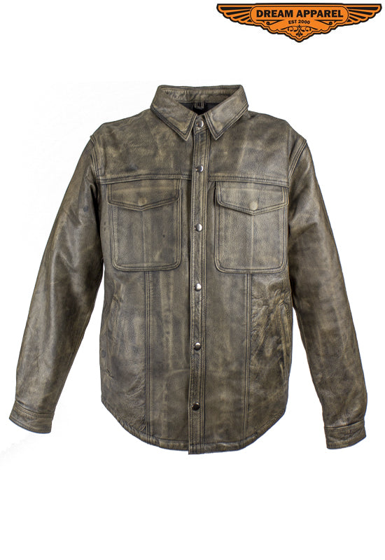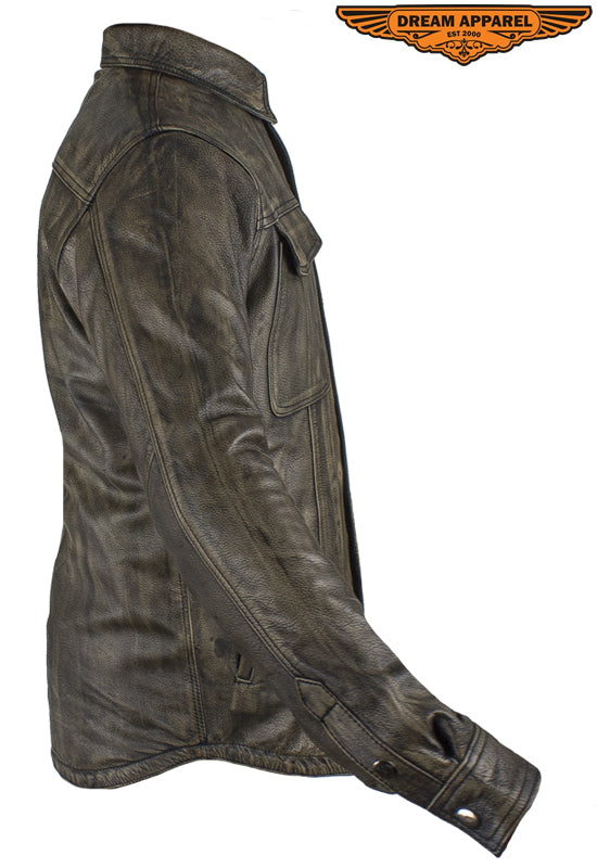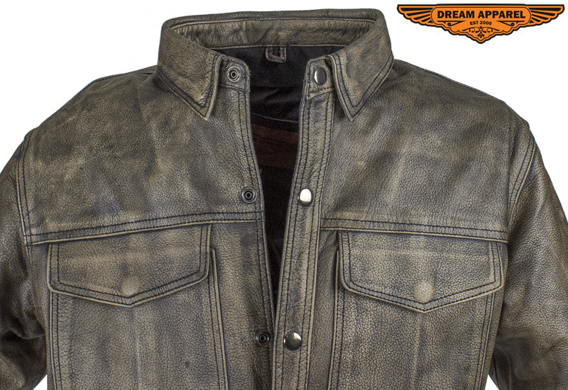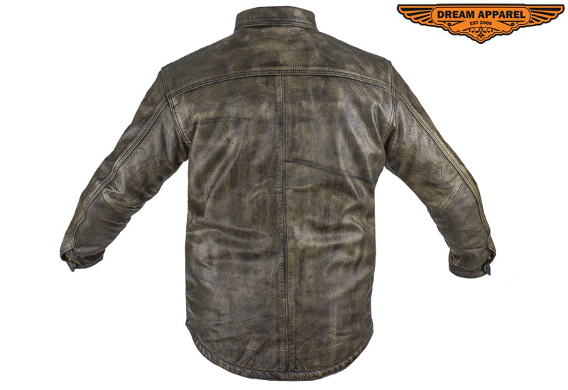 Mens Distressed Brown Leather Motorcycle Shirt With Concealed Carry