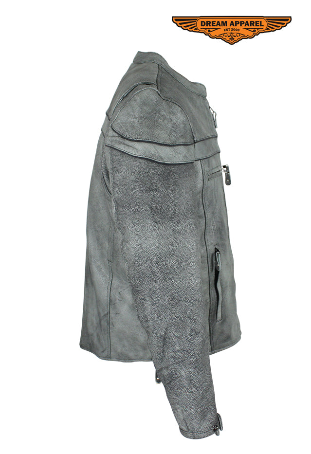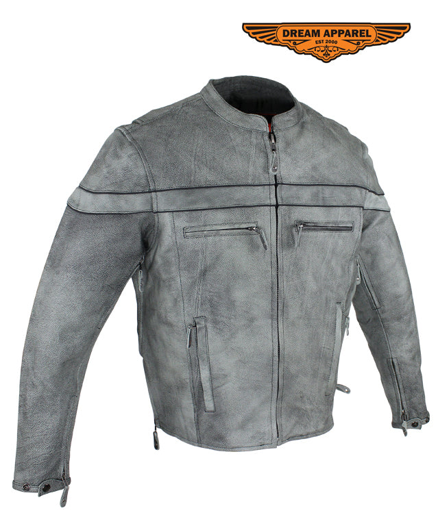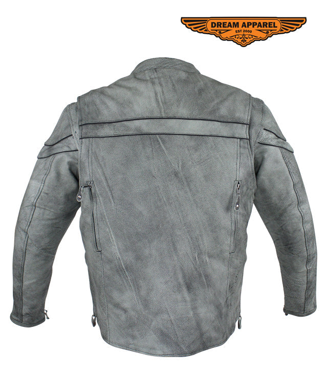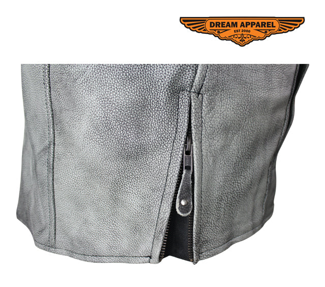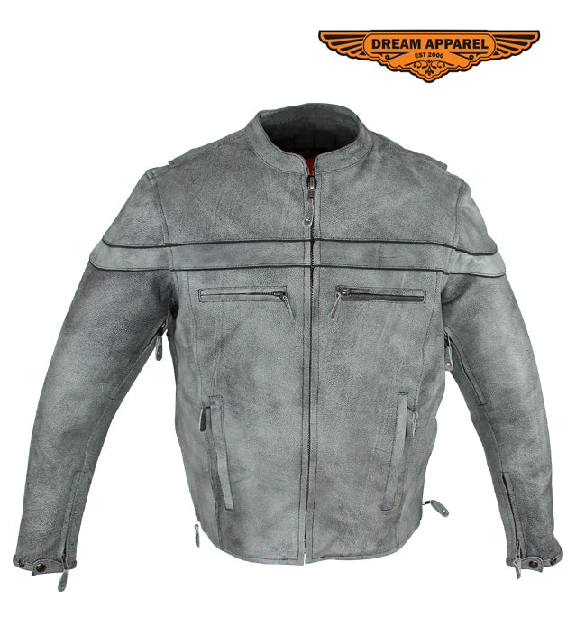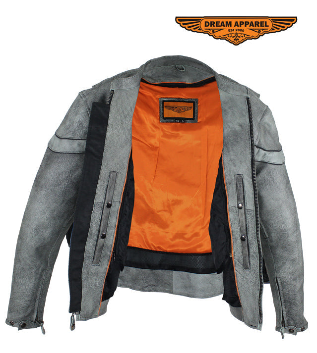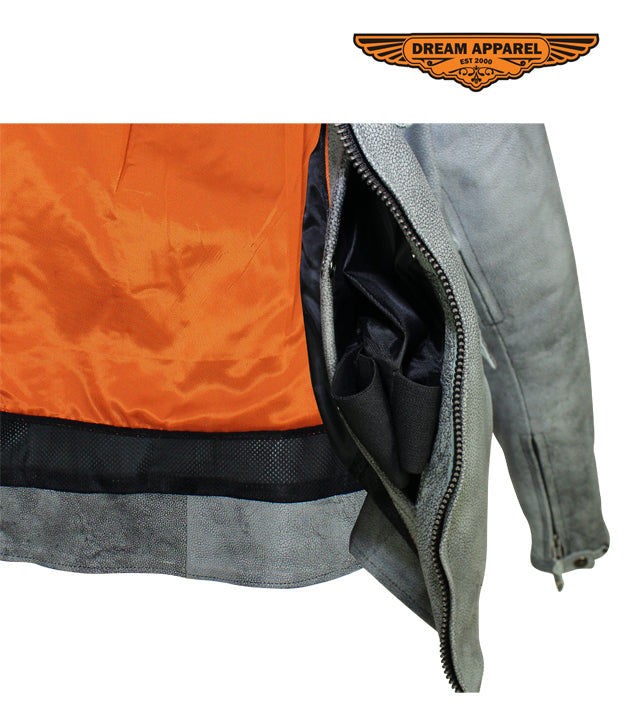 Treat yourself to the slick style and practicality of this smart design by Dream Apparel. This beautiful gray naked cowhide leather motorcycle jacket features two large concealed carry pockets inside with double button-snaps and a neat arrangement of double piping that runs across the front, shoulders, and back. Comfort's built-in with a racing style collar, a zippered front closure, zippered cuffs with button snaps, and zippered sides for that perfect fit. Ride all year long with a orange full lining that runs through the sleeves for cooler weather or take it out and open the two zippered air-vents on the front and back and feel the wind through them and the grommets under each arm for warmer days. The two zippered waist pockets on front give you plenty of room for wallet or keys. This wonderful design sells out quickly so be sure to order today and whatever you do, don't miss out on this sought out jacket.