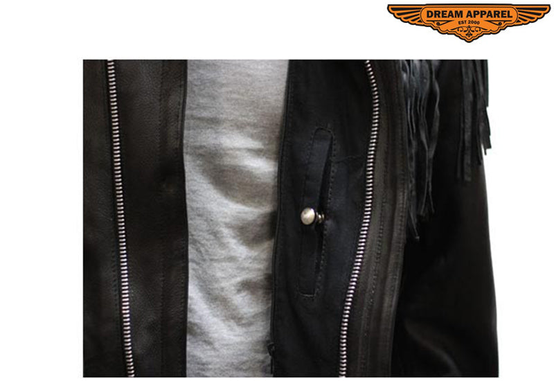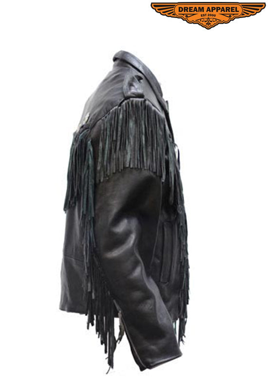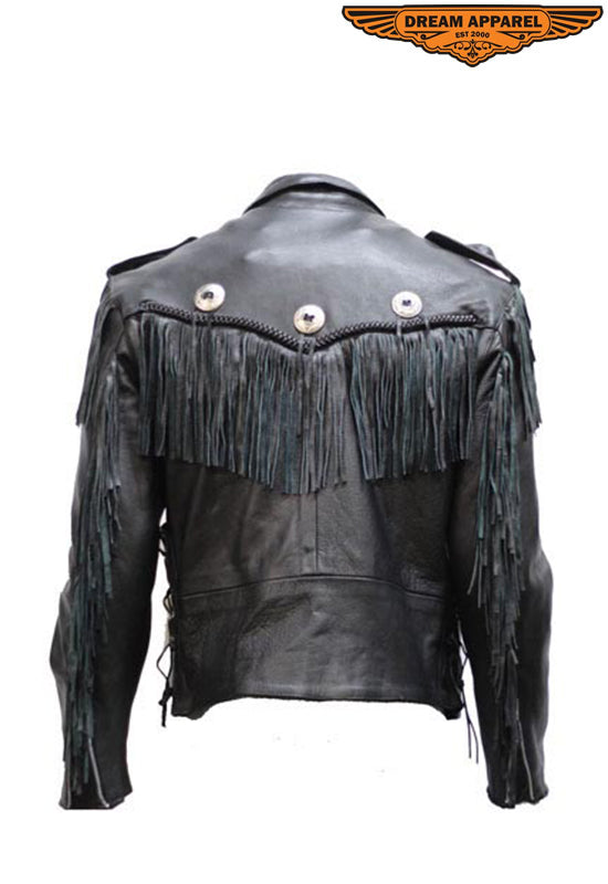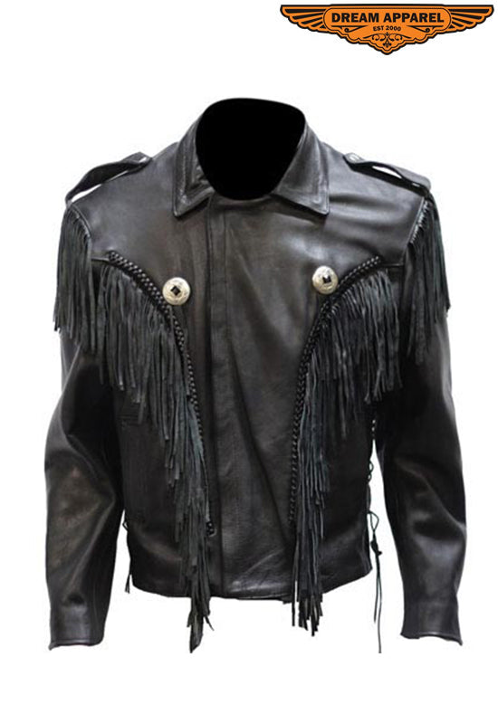 Confidence in a rider only comes from his heart. As a rider, you most liking know Bon Jovi, he did not only bring us good music but he brought upon style to match. Here today we present the style to keep on giving, The Bon Jovi Jacket. Made with the passion of our craftsmen and tailors, this genuine leather shows off better than you would expect. From head to toe, this jacket is full of surprises, and we aren't talking about all the pockets located inside and out. It starts off with a neck warmer to keep you snug and toasty. Going down, there are Concho's on the front and back. Including stylish braids and fringe covering the front and back. A Zip-out lining running through the sleeves to give you more options on the kind of comfort you want. On the end of those sleeves are zippered cuffs for when you want to free up your forearms, whether the ride or around town. Sliding to the side, we have laces to help adjust the fit so you can fit right in. The leather is soft and will be able to endure through your venture. A comfortable feeling know that your jacket was tailored correctly. Heavy leather, made well, staying strong from the material to the zipper.