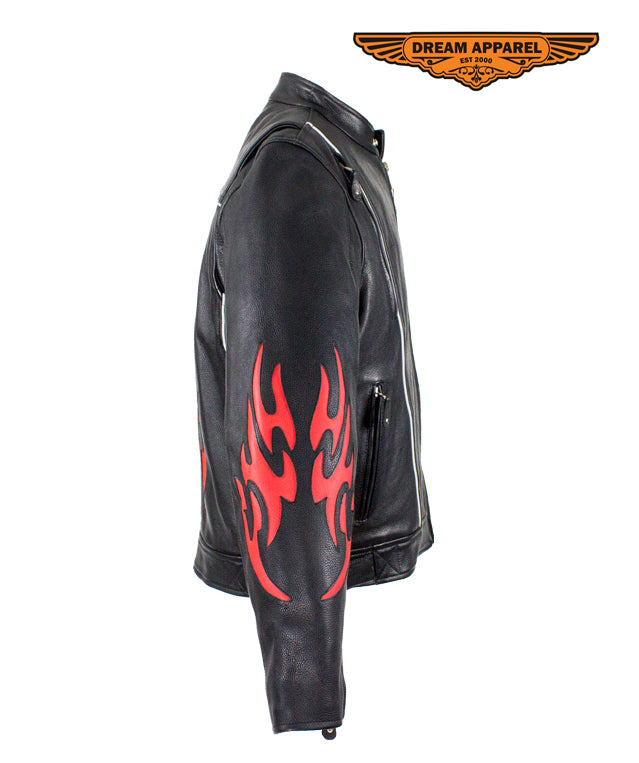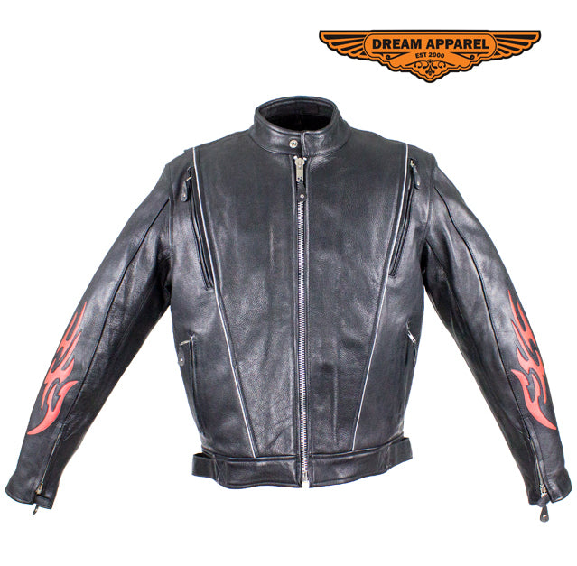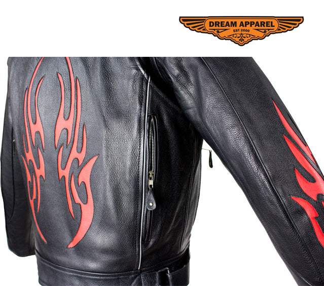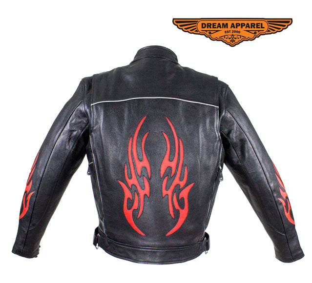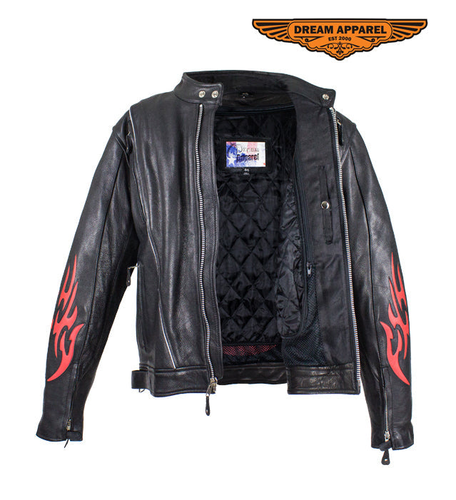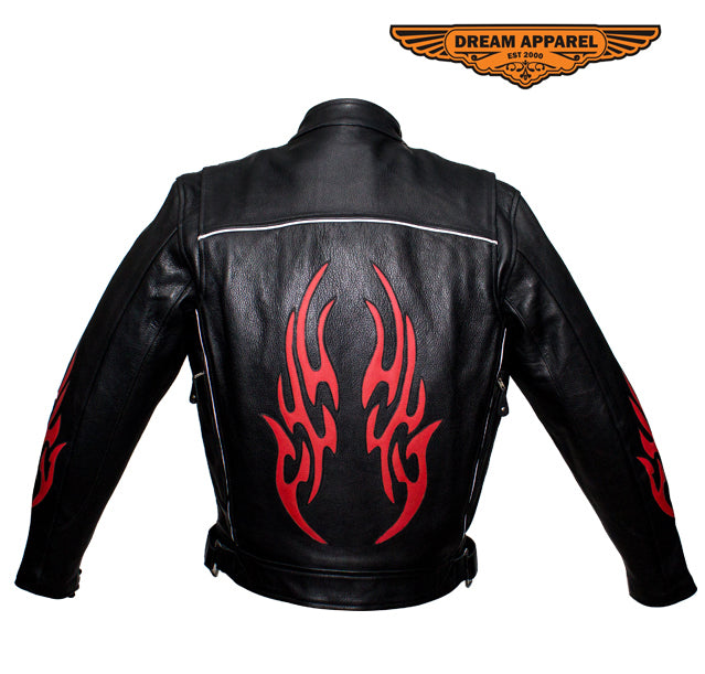 Dream Apparel feeds your burning passion for speed in their racing inspired, genuine leather jacket. Our heavy-duty, soft leather jacket prominently displays vibrant, red, burning flames on both sleeves and on the back. A racing style collar, a soft, quilted lining that runs through the sleeves, a pair of zippered air vents on front and back, adjustable straps on the sides of the waist, a zippered front closure, and zippered cuffs all ensure your maximum comfort and the greatest fit. Two large zippered waist pockets and two roomy inside pockets allow you to bring it all with you while the refelctive piping on the front and back lets you do it safely making this dynamic racing jacket a smart chioce at an amazing savings.