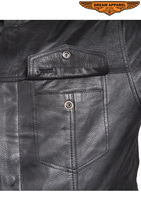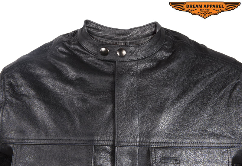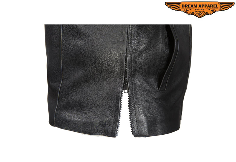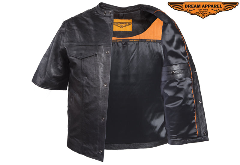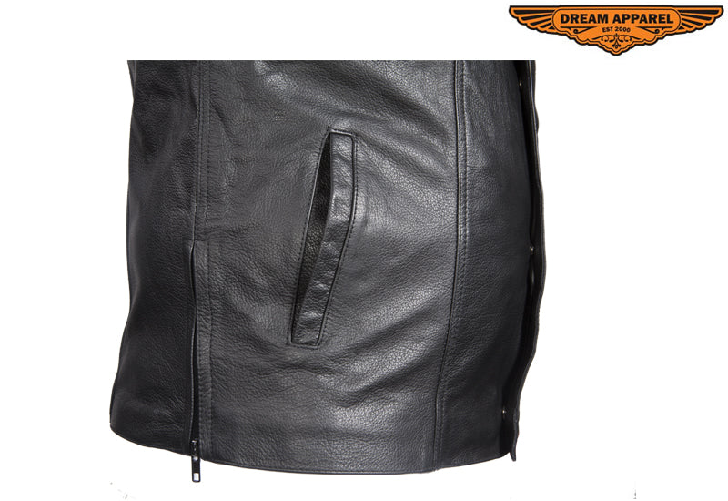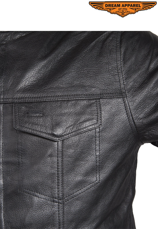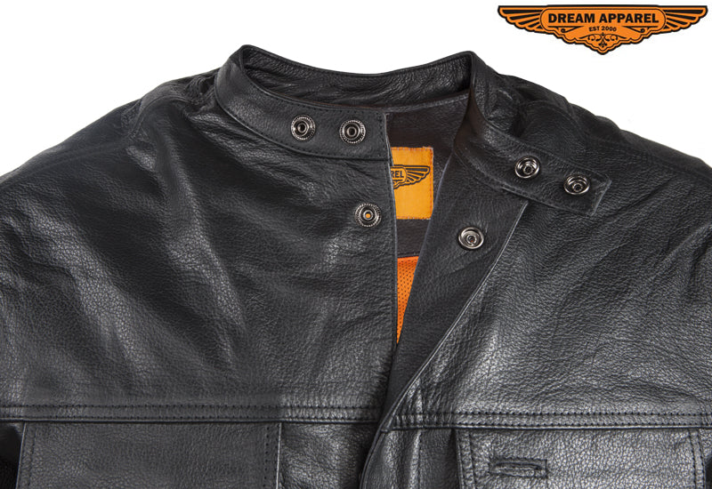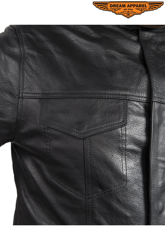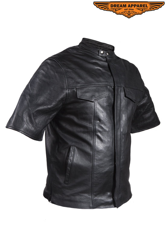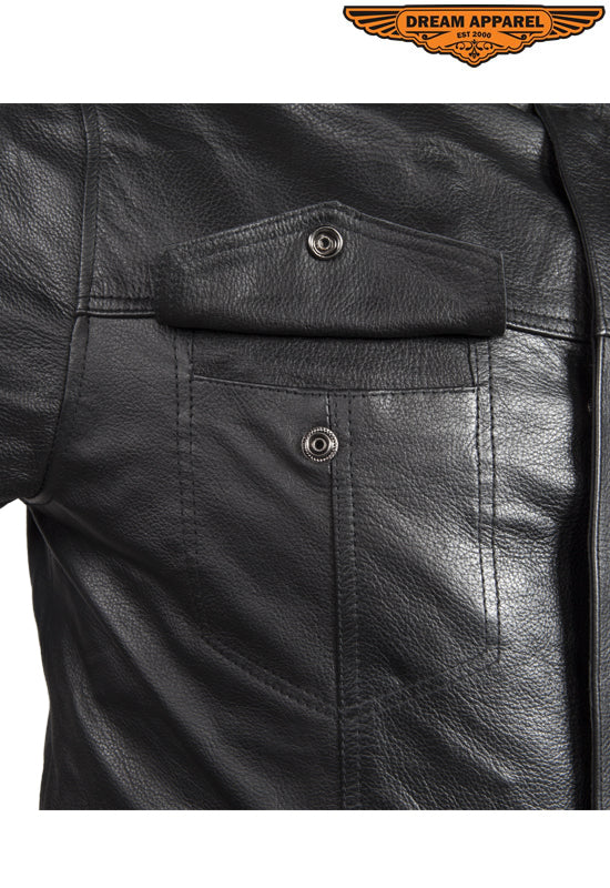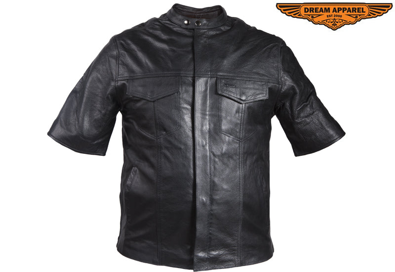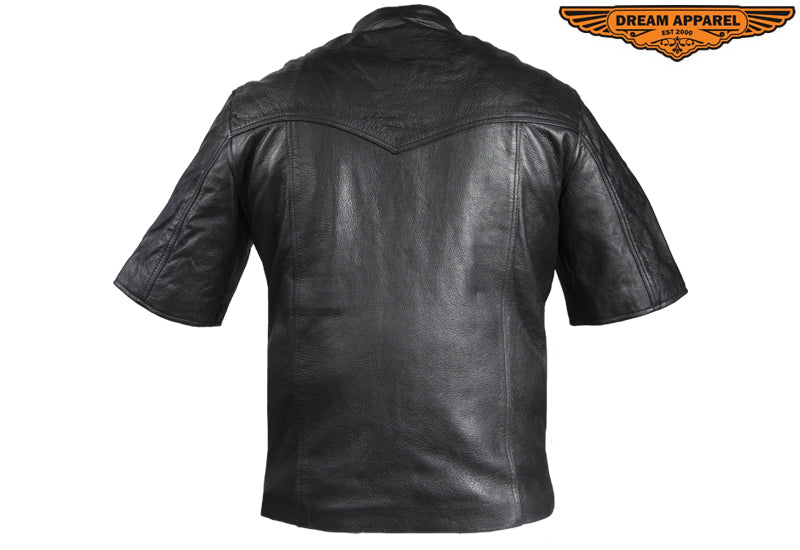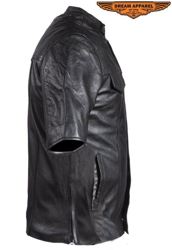Enjoy the comfort while riding during those hot summer days. This men's light weight leather motorcycle shirt is perfect for those hot summer days. The shirt features not two, but four front pockets and zipper on each side to adjust fitting for when getting ready to ride. The shirt for bikers features European style collar and concealed carry pocket inside.