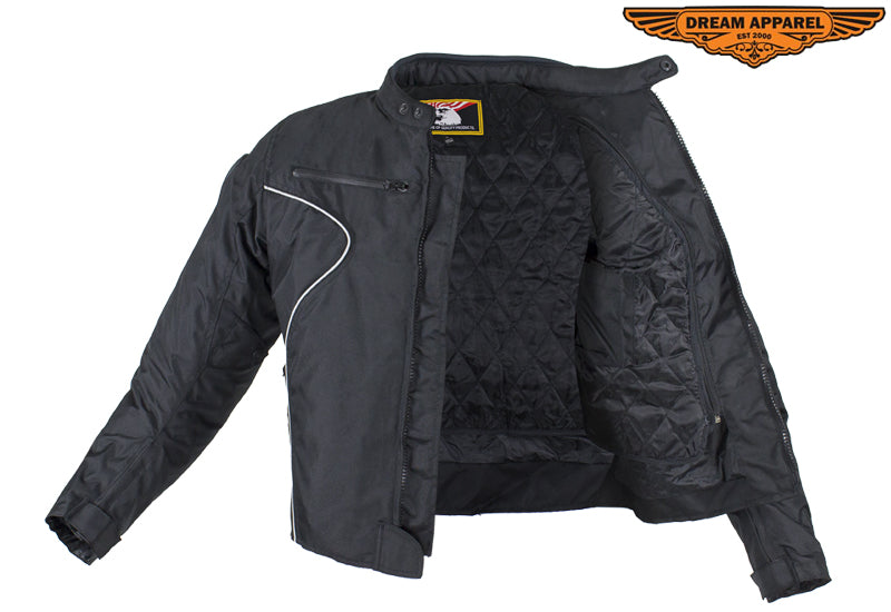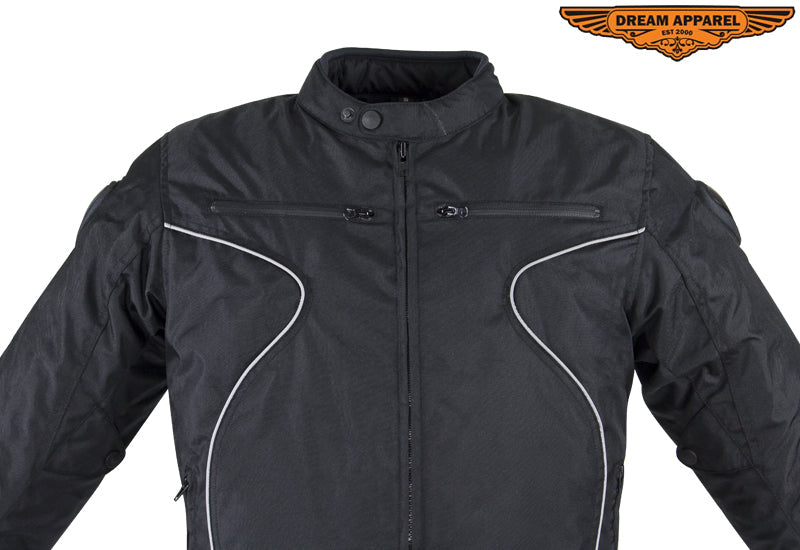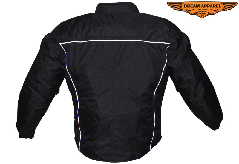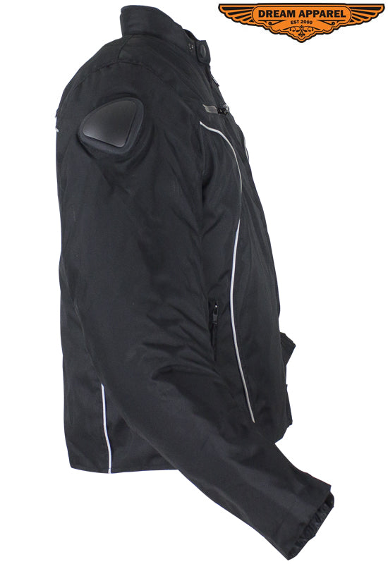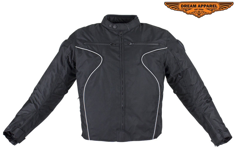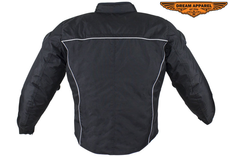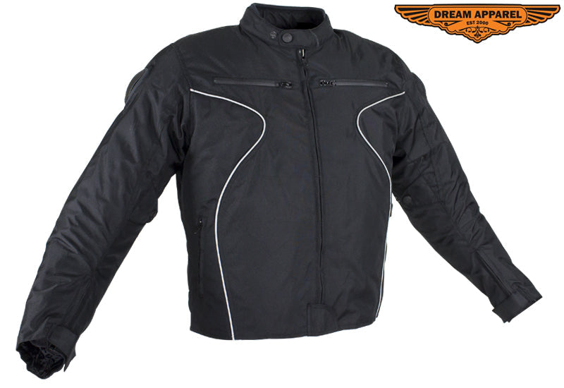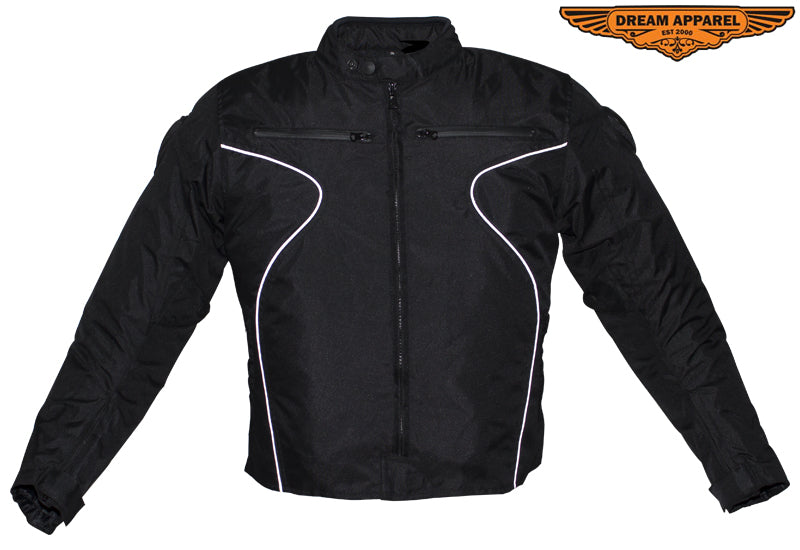 Men's beautiful lightweight jacket with Z/o lining, removable foam based Certified Armor on the elbows, back, and shoulders, a reflective stripe on jacket for safer riding at nigh, multiple pockets and zippered cuffs for a great fit!