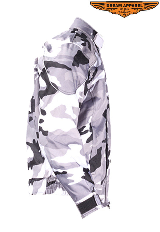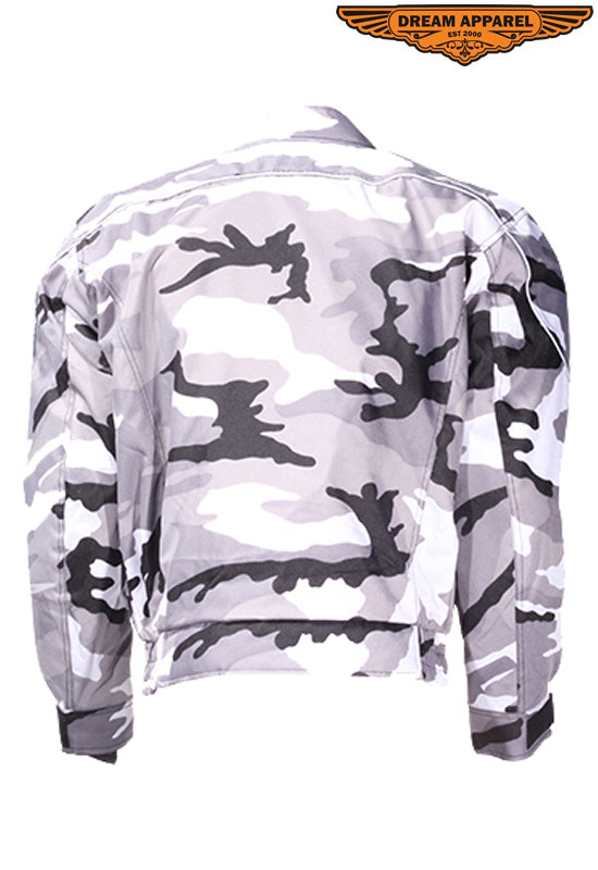 Great looking white camoflauge men's mesh motorcycle jacket can be yours at a great low price! This jacket features a Z/o lining. protective pads on shoulders, arms, and back, multiple pockets, and zippered cuffs!