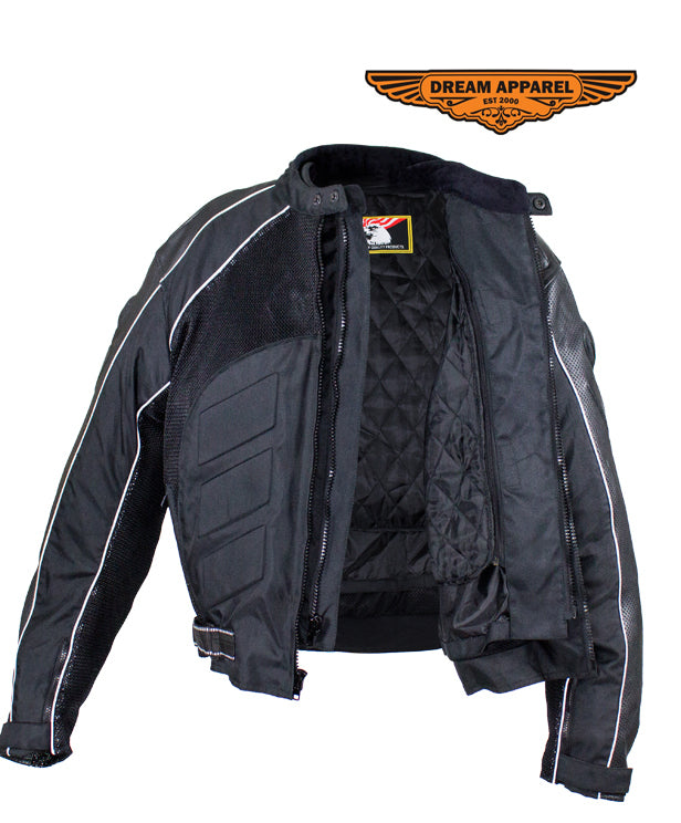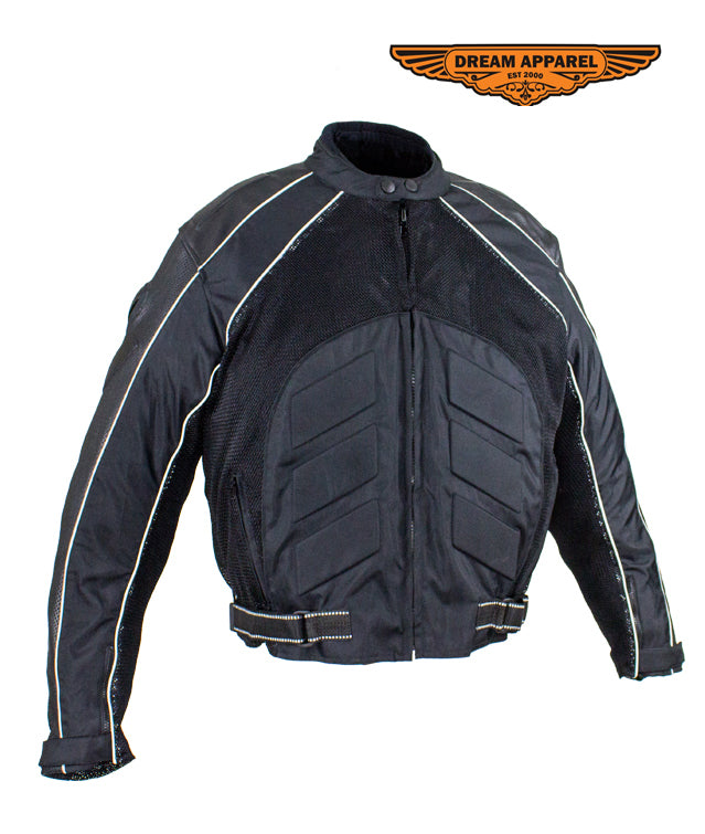 This beautiful men's jacket in black is made from nylon features a Z/o lining, a reflective strip on the front and back for safer rides at night, removable foam based Certified Armor on the elbows, back, and shoulders, strap on the sides and zippered cuffs for better fitting.