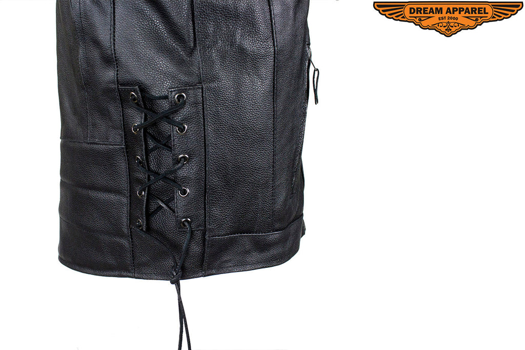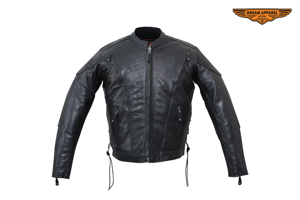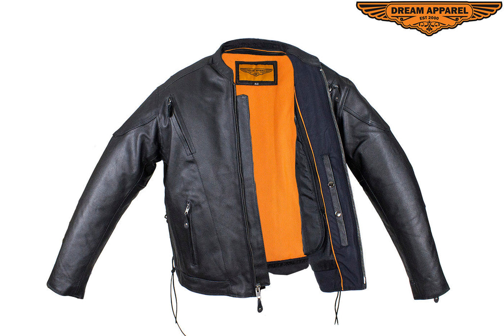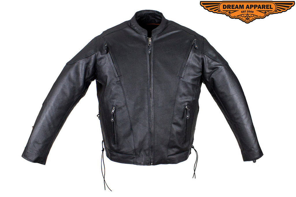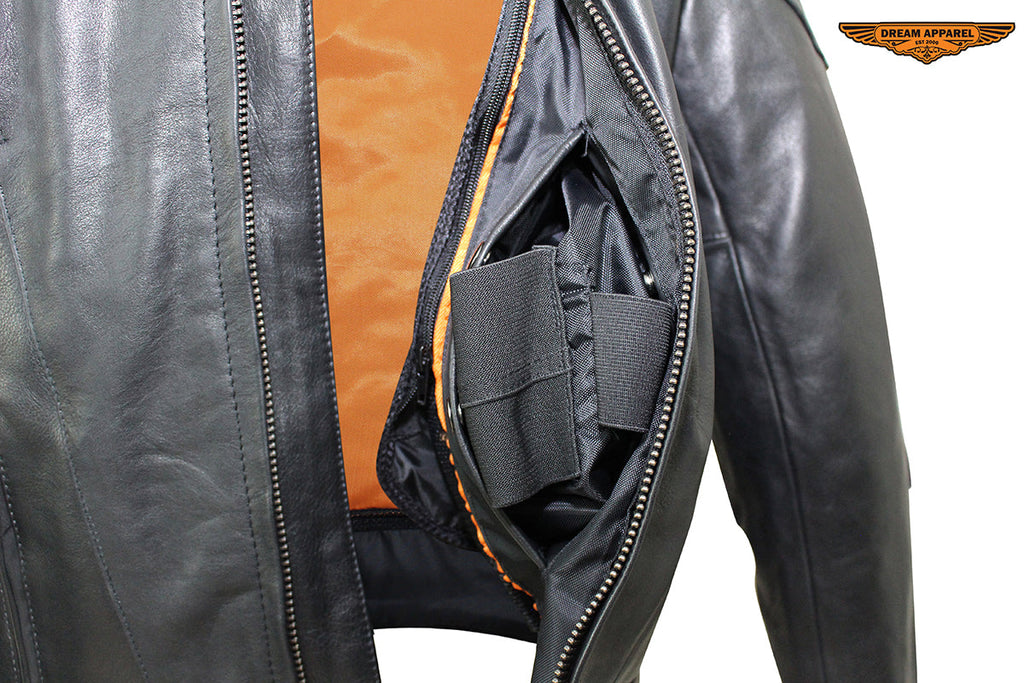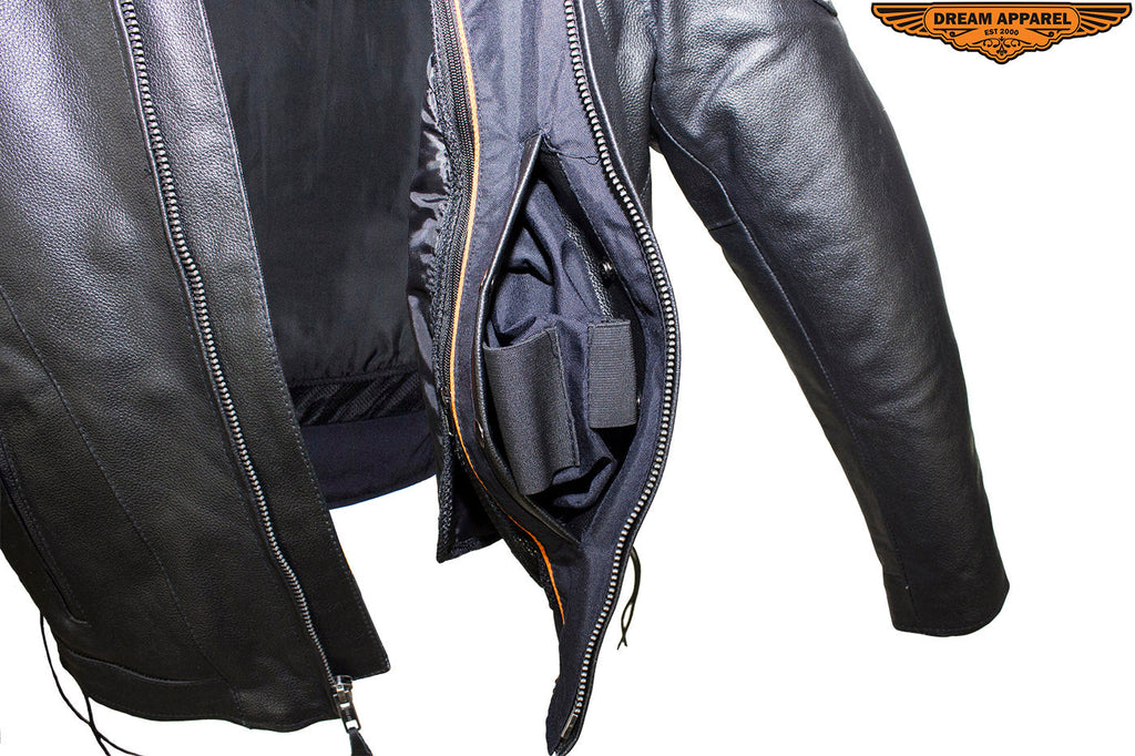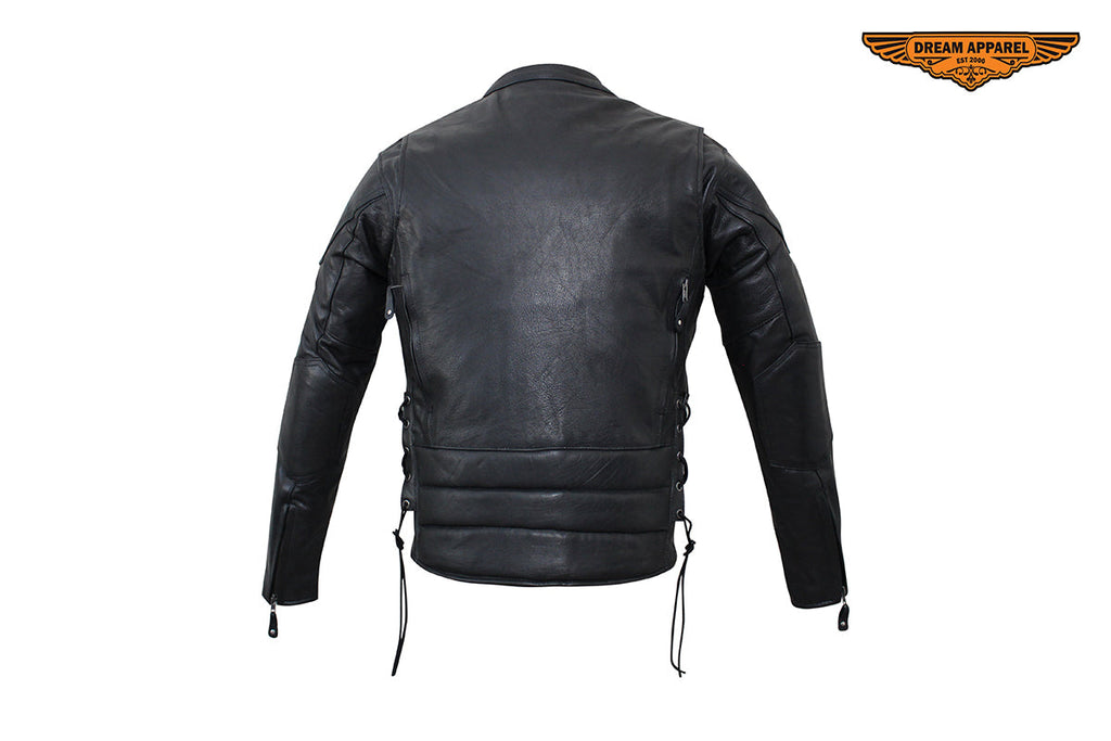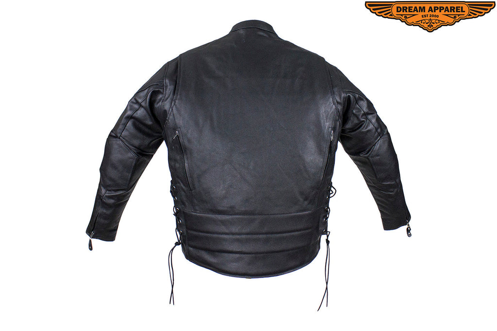 We made this Men's Racer Jacket from genuine naked, "Soft Touch" cowhide leather with your personal security in mind. You'll have plenty of protection and room for the trip with two large interior buttoned gun pockets with elastic straps and two roomy waist pockets outside with zippered closures. Other features include extra leather over the elbows, a padded bottom back piece, and full one-piece panel on the pack for all your patches. On cooler rides, you'll appreciate the warm lining that runs through the sleeves. Once it warms up, remove it to reveal a cool black mesh lining and open up the two zippered air vents on the front and two on the back. Zip yourself up and make yourself even more comfortable with the snug zippered cuffs, leather laces on the sides, and a button-snap, padded racing style collar. If you're looking for a premium leather racing jacket, then order now because supplies won't last.