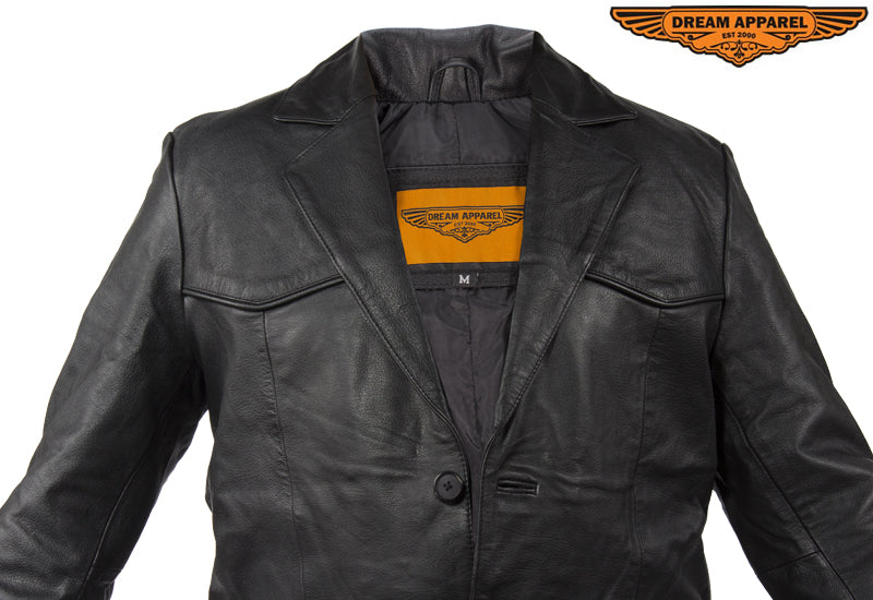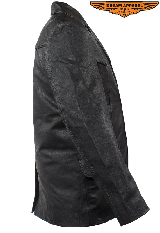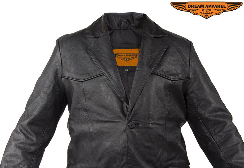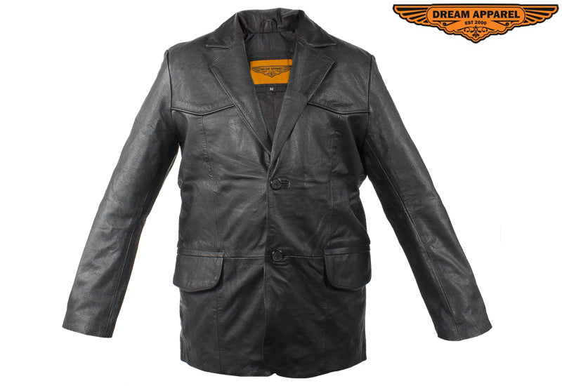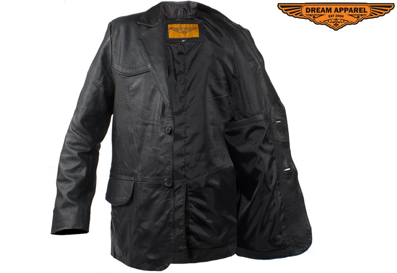 Make a grand appearence in this slick blazer made from the highest grade soft leather and cut in the traditional style with notched lapels and a vented back. The smooth regular lining and double button front closure will let you easily slip it on and button it up for a great look and feel. Two large slip pockets outside and a roomy inside pocket provide plenty of room for a wallet, keys, phone and anything else. Look sharp and save money in this fantastic blazer by Dream Apparel.