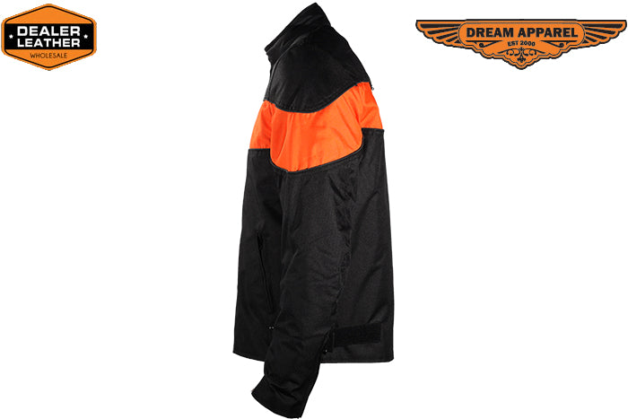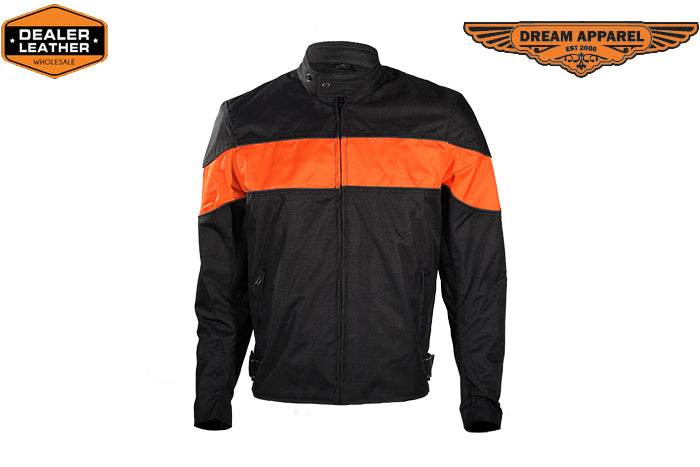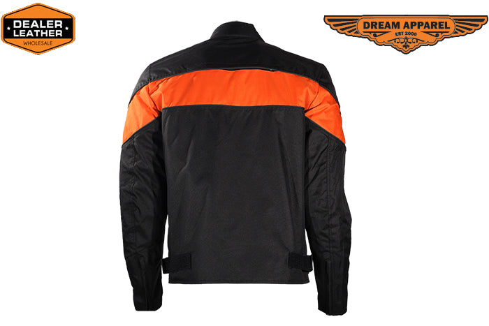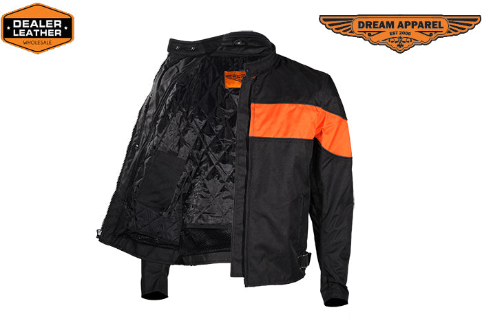 This mens motorcycle jacket does not feature armor or padding. However, it features stylish wide orange stripe on the front and on the back of the textile motorcycle jacket. Multi pockets on this textile motorcycle jacket allow the rider to store almost everything at hands reach.