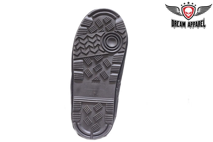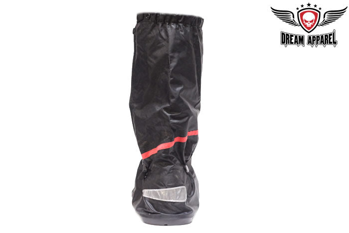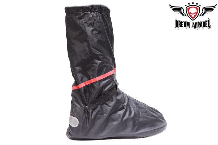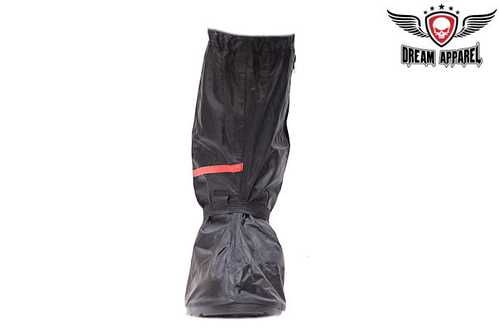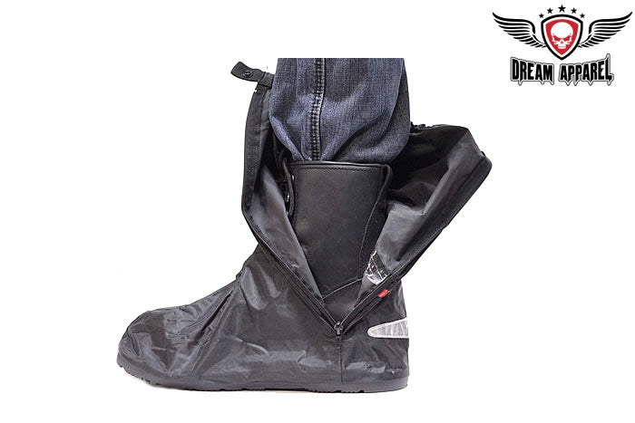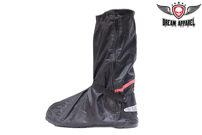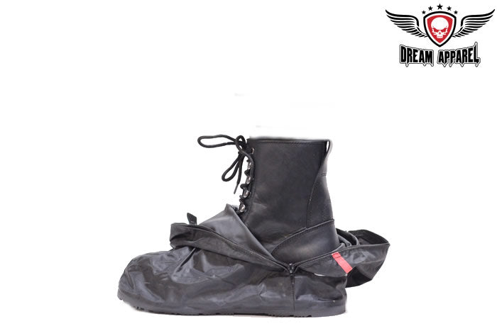 Being an avid motorcycle rider takes a lot of determination, you can never predict what conditions will lay ahead on your journey. Some days your cruise is care free with bluebird skies, other days you have swamp foot due to wet precipitation/bad weather. Well no need to worry about rain or snow anymore because Dream Apparels RainGuard boots have males and females covered. This boot rain cover is made of durable nylon material coated with PVC to create a top of the line water resistant boot cover. Created with biker boots in mind these rain cover boots have a thick rubber sole on bottom for extra traction and durability for riding or walking. Elastic ankle strap with snaps to keep snug in motion, safety orange side strip and reflective heel. Top cuffs have internal elastic band with snaps to keep out moisture and side zipper to easily slip on or off your boots. These biker rain boot covers also pack up to the size of a single sneaker for easy storage in any motorcycle bag, so next time theirs bad weather your feet will stay dry like a sunny day.