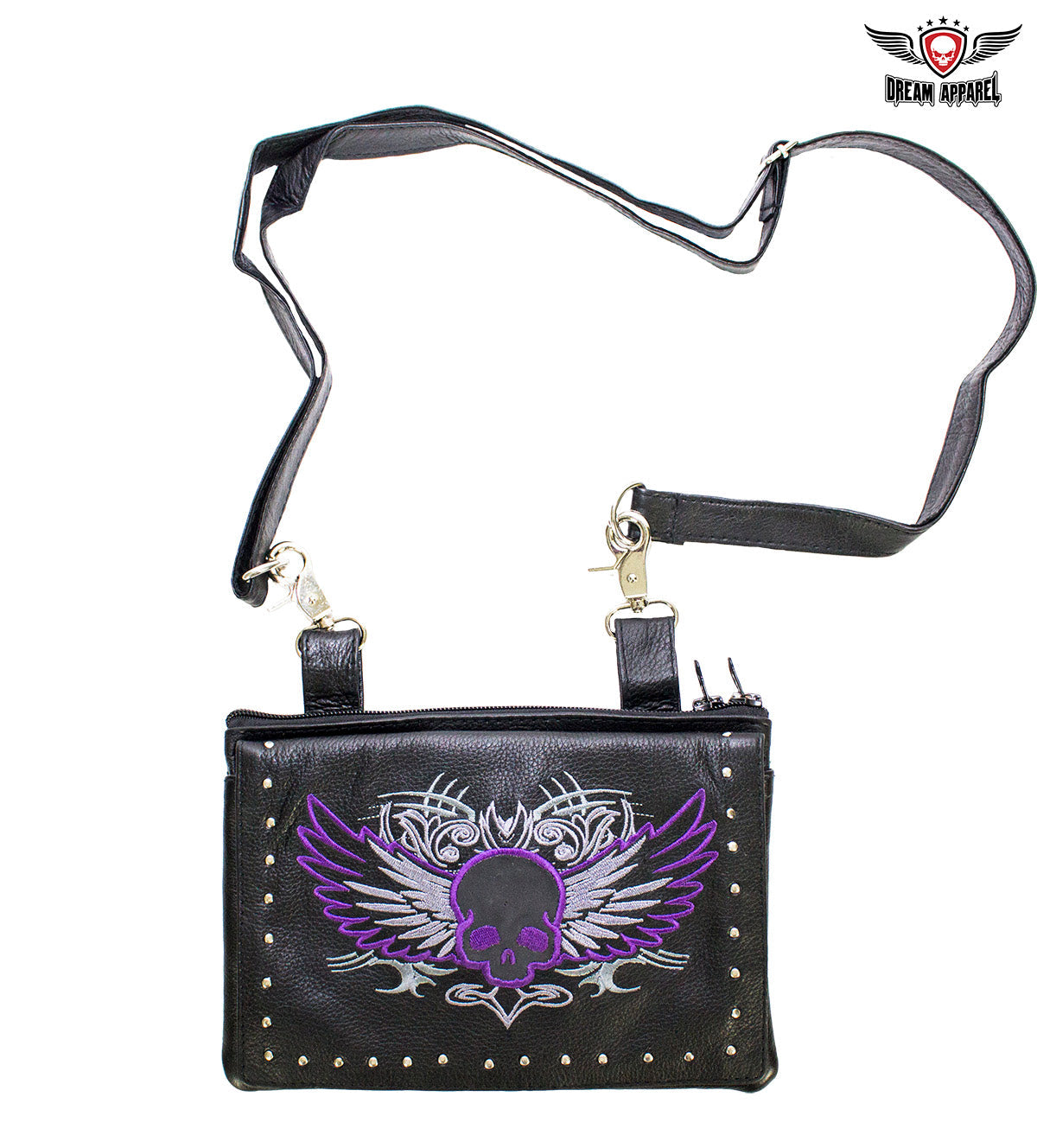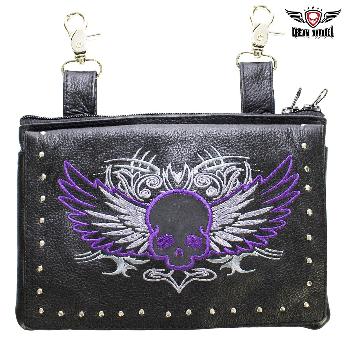 Our delightful 9" x 7.5" naked cowhide leather belt bag is made for anyone that carries a concealed handgun. A zippered compartment with a strong Velcro strap inside lets you carry any large caliber handgun securely. A large dual magnetic flap pocket on the front and an equally large zippered pocket on the back let you carry a large cell phone and more with ease and comfort. Decorated with a purple skull in a silver graphic and bordered by shining chrome studs, you can fasten it easily to your belt loops with two large chrome lobster clasps and never ride unprotected again. Order yours today.