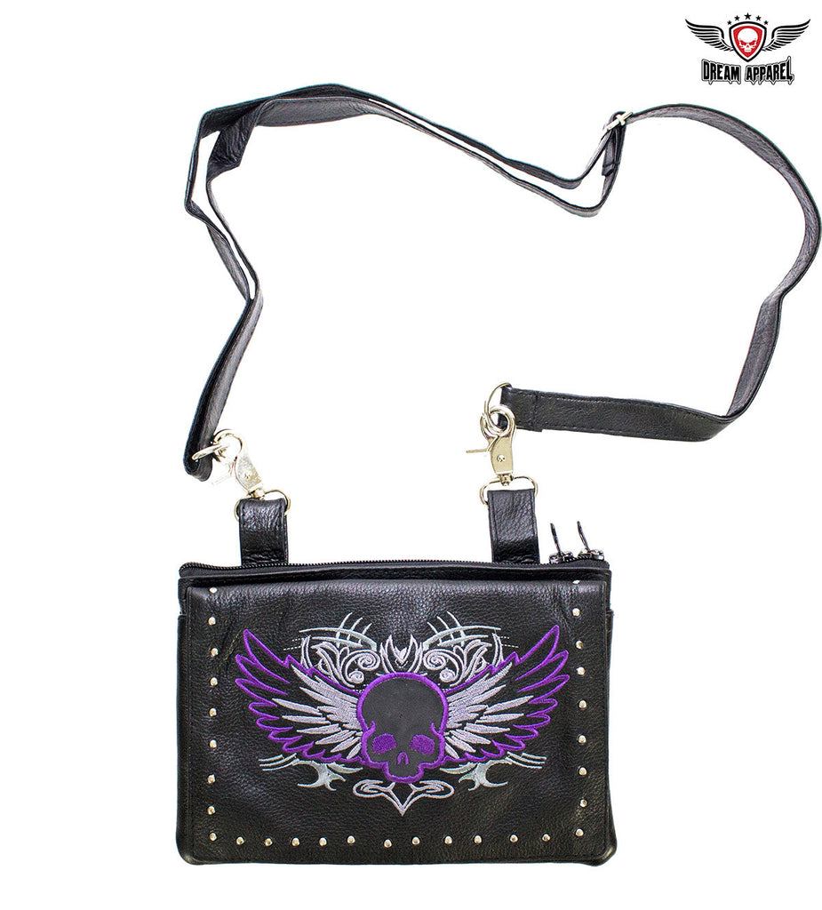 Naked Cowhide Leather Purple Skull Gun Holster Belt Bag with Studs