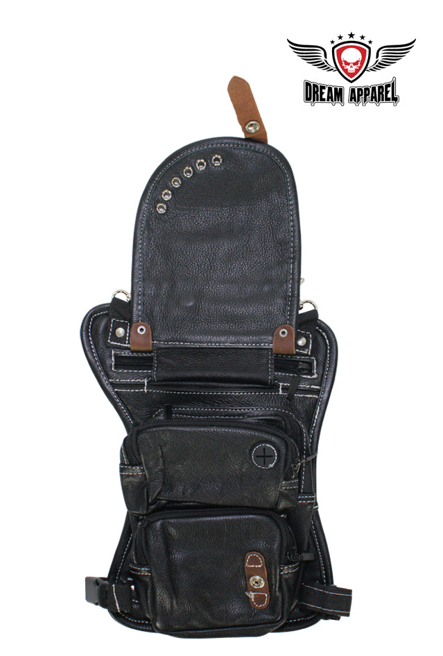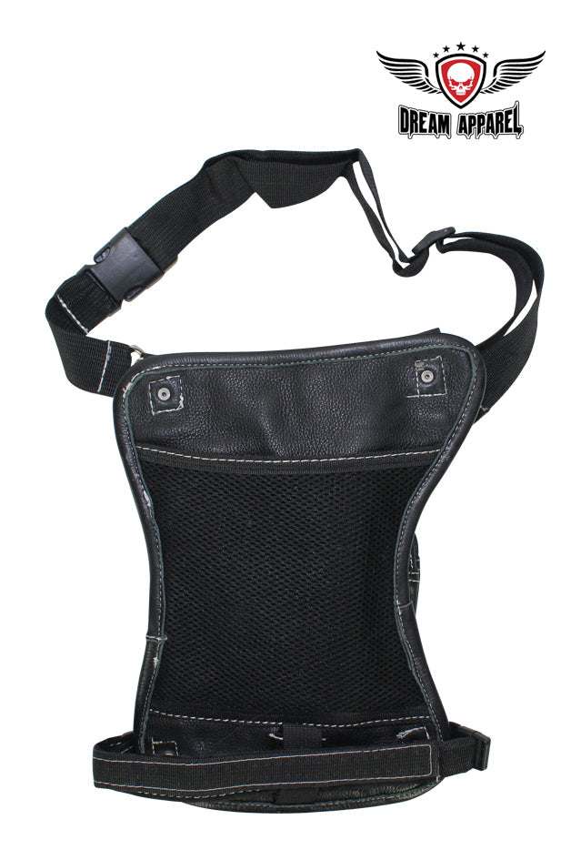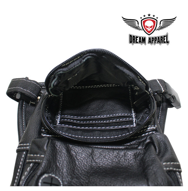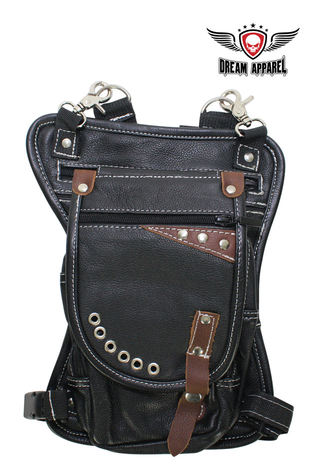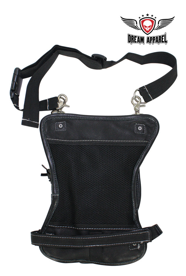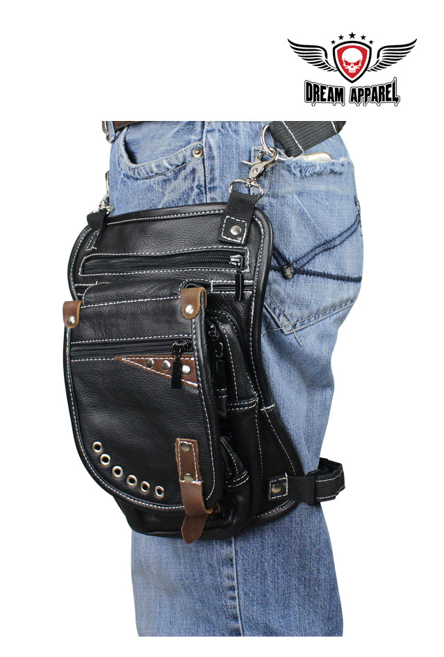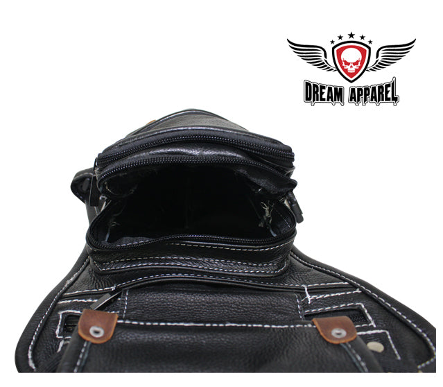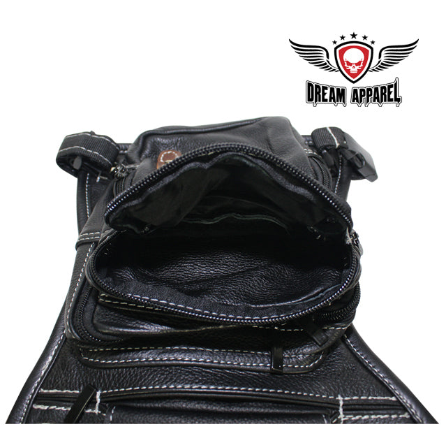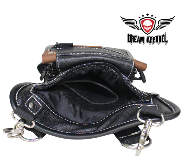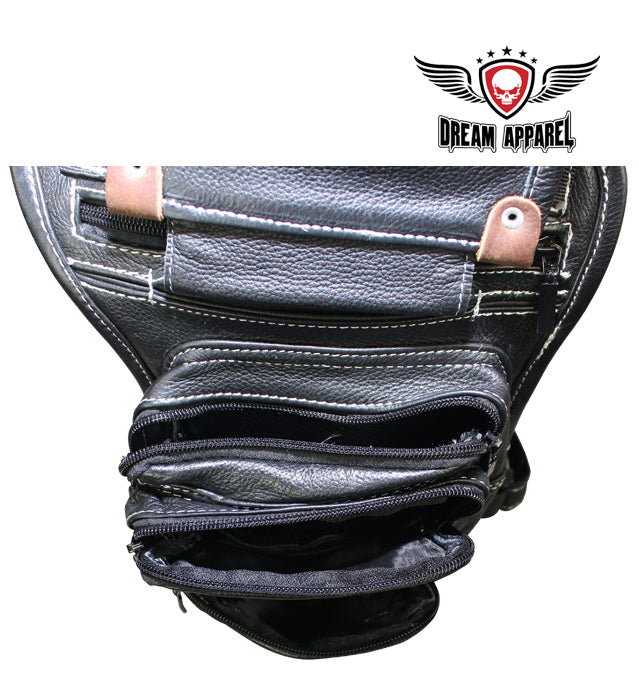 Here at Dream Apparel, we work to give you the best thigh bag experience you've ever had. With that being said, we'd like to introduce our beautiful new black naked cowhide leather thigh bag featuring a touch of dark brown. You will not be disappointed, this look is really eye catching and looks very stylish. This beauty is unique in many ways. At the top of the bag, you are met with the largest pocket which features a gun pocket. Under that, another zippered pocket is on the large strap. Once you unsnap this strap, you have two more zippered pockets. Large lobster clasps allow easy attachment and detachment. This bag is perfect for any