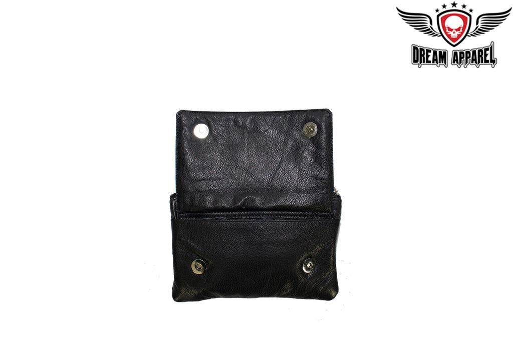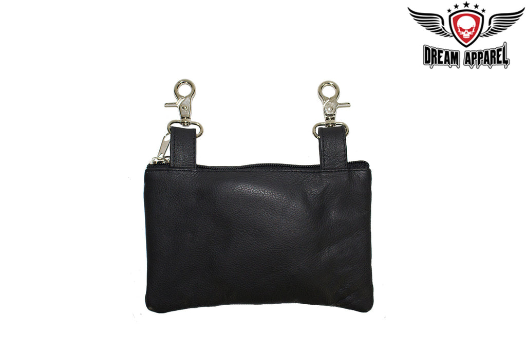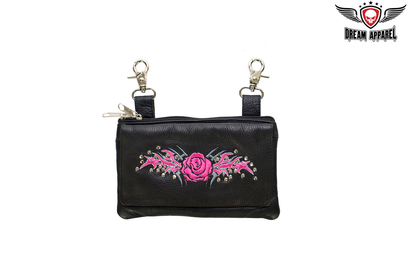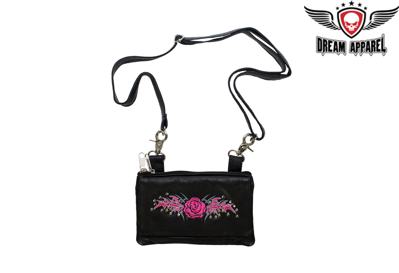 Dream Apparel's 8.5" x 5.5" All Naked Cowhide Leather Belt Bag with a Pink Rose is perfect for quick runs to the store or long runs to that favorite rendezvous. It features a pink rose and graphics with gray highlights and chrome studs on the front flap. The dual magnetic flap opens to reveal a roomy textile lined compartment large enough for an iPhone 6 while the two zippered main compartments let you carry loads more. You can attach it to your belt loops via the two large chrome lobster clasps or sling it over your shoulder with the adjustable strap that comes included. Order yours today.
