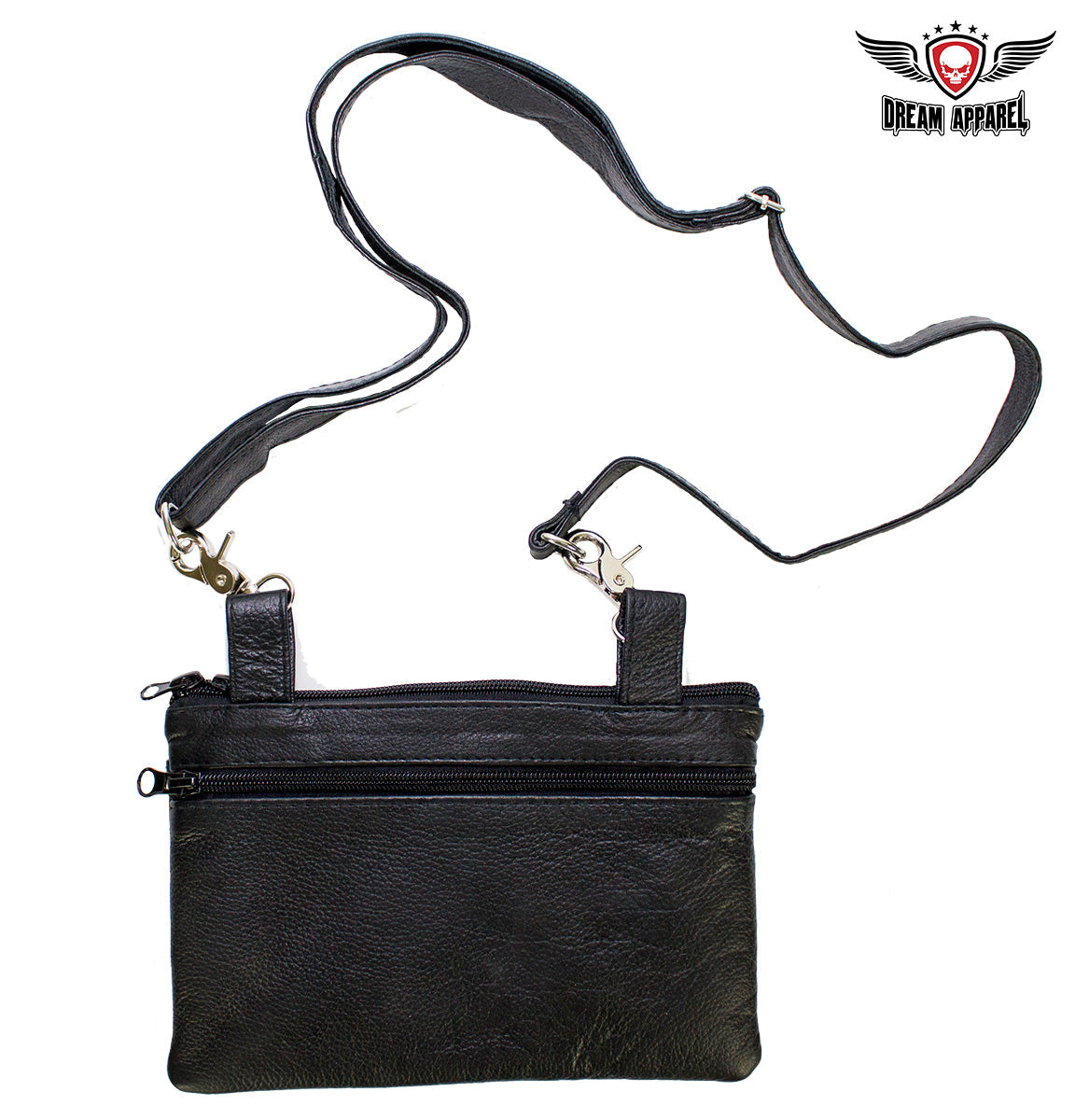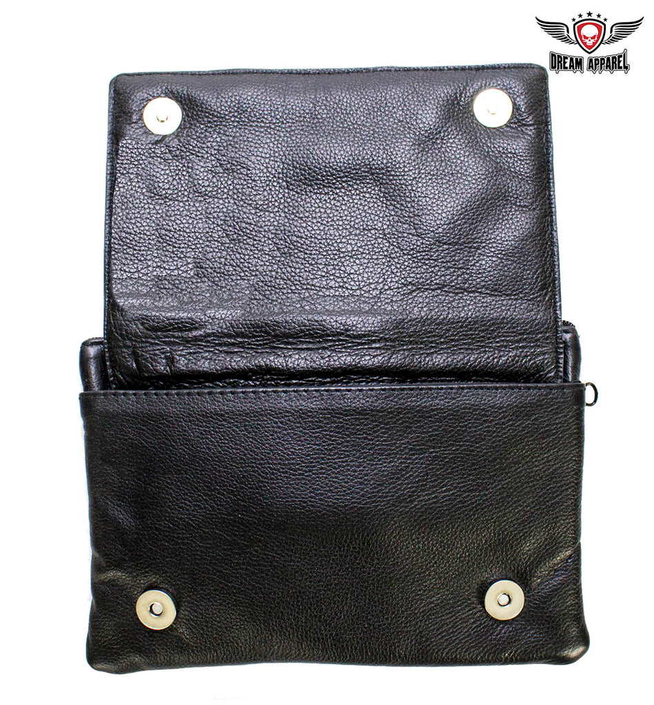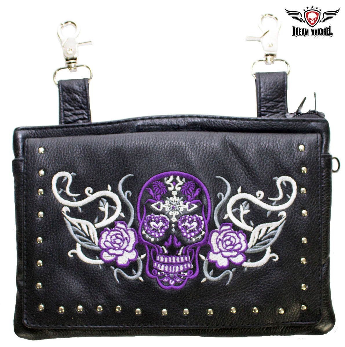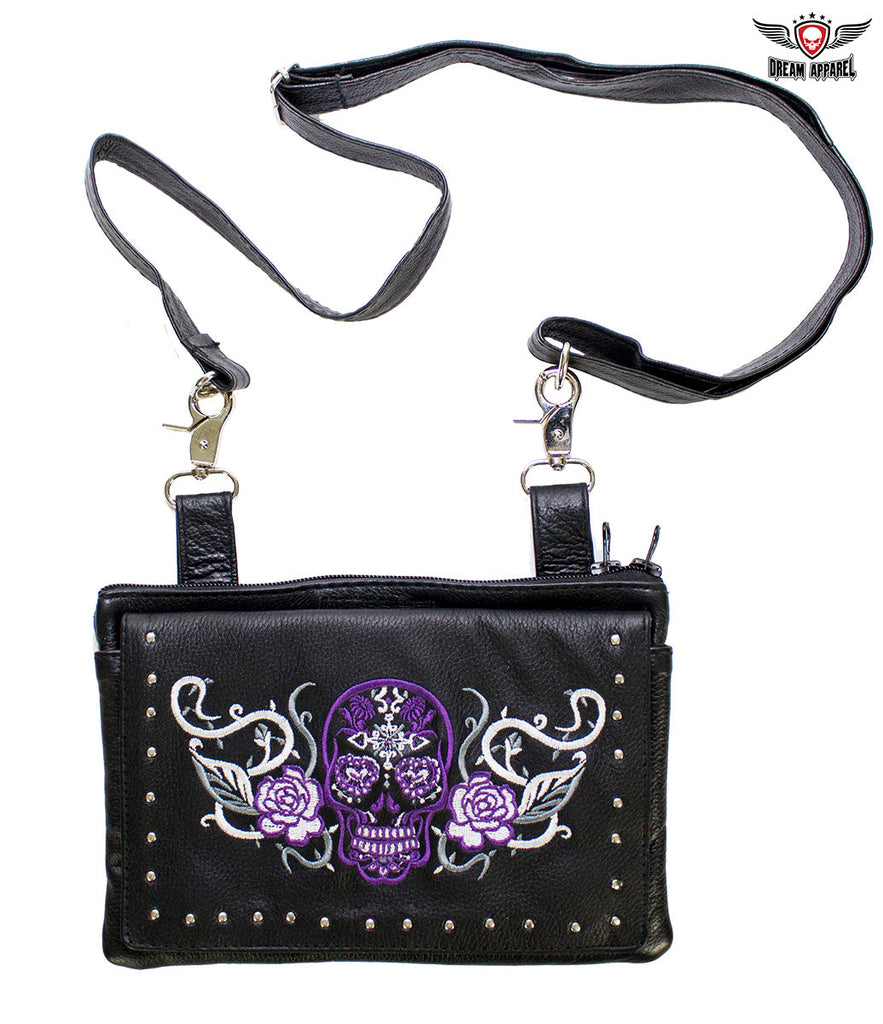 Our delightful 9" x 7.5" naked cowhide leather belt bag is made for anyone that carries a concealed handgun. A zippered compartment with a strong Velcro strap inside lets you carry any large caliber handgun securely. A large dual magnetic flap pocket on the front and an equally large zippered pocket on the back let you carry a large cell phone and more with ease and comfort. Decorated with a purple and white Sugar skull with white roses on the flap with chrome studs, you can fasten it easily to your belt loops with two large chrome lobster clasps and never ride unprotected again. Order yours today.