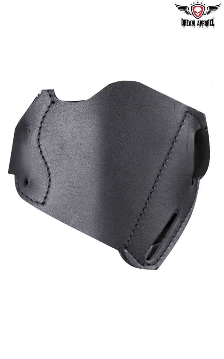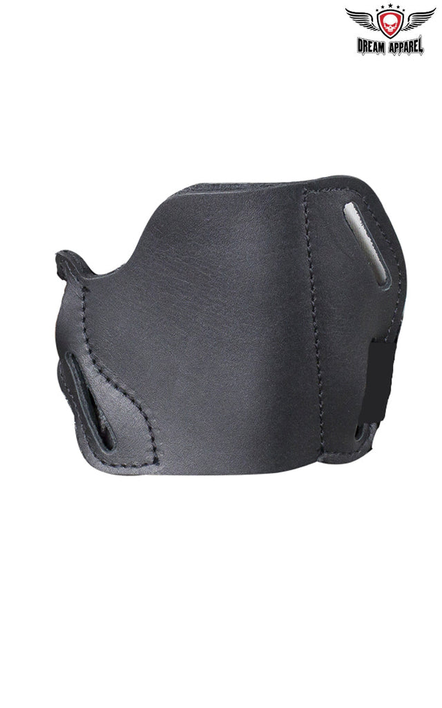 This straightforward black gun holster by Dream Apparel features two genuine leather pieces sewn together to create a pocket with cut outs so you can slide it easily onto your belt. This holster's cut to fit most small to mid-sized handguns and an excellent choice for anyone who values their personal protection.
