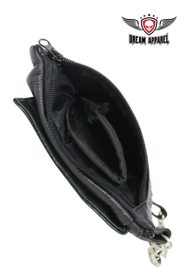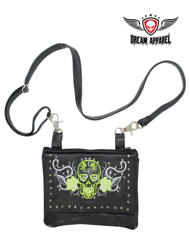 Dream Apparel's beautiful naked cowhide leather lime green and white sugar skull designed belt bags with studs is a must have whether you're looking to just go to the store or meet up with your peers at the rendezvous point. Whatever you choose to do, do it in style with this belt bag. It features a lime green and white Sugar skull with white roses and chrome studs on the front flap pocket. This addition is a bit larger at 9" x 7.5"and does indeed have a gun pocket included. A dual magnetic flap opens to reveal a roomy textile lined compartment large enough for an iPhone X while the two zippered main compartments let you carry loads more. You can attach it to your belt loops via the two large chrome lobster clasps or sling it over your shoulder with the adjustable strap that comes included. This stylish piece can be yours today so don'tmiss out, grab yours now!