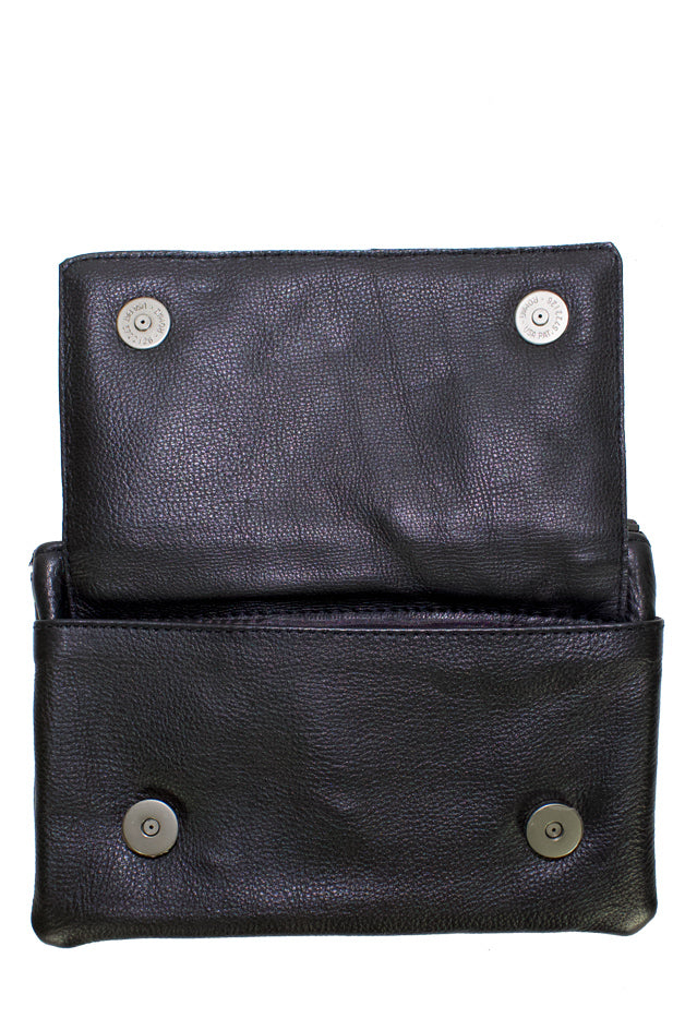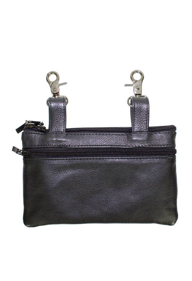 Dream Apparel's 8.5" x 5.5" Studded Naked Cowhide Leather Belt Bag with Lime Green Wings is the perfect belt bag for a long bike run or a night on the town. It features a grey flying heart with hot lime green wings and chrome studs on the front flap. The dual magnetic flap makes a great compartment to carry any large cell phone easily while the two zippered, fabric lined compartments let you carry everything else. It can be clipped to your belt loops by the two sturdy lobster clasps or worn over your shoulder with the leather strap that comes included. This delightful belt bag is the perfect complement to your riding gear so place your order today.