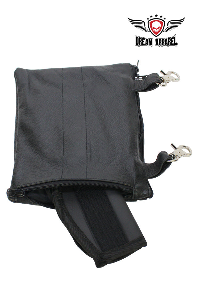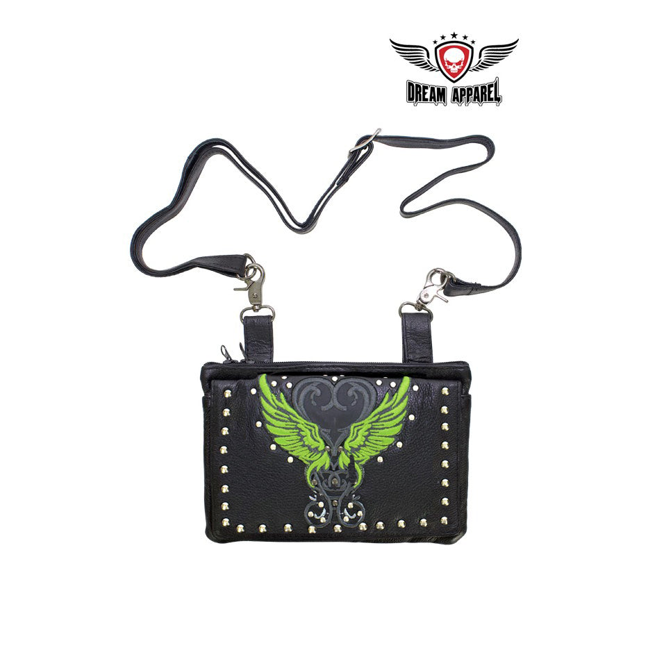 This terrific 9" x 7.5" naked cowhide leather belt bag is perfectly made for anyone that likes to carry a concealed handgun. A zippered compartment with a strong Velcro strap inside lets you carry any large handgun securely while the large dual magnetic flap pocket on the front and equally large zippered pocket on the back let you carry a large cell phone, other valuables, and more. Wonderfully designed with a black heart in a red and silver graphic on the flap with chrome studs that border the flap and highlight the graphic, it clips securely to your belt loops with two large chrome lobster clasps that let you enjoy the freedom, comfort, and safety of riding protected wherever you go.