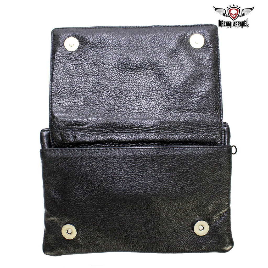 Dream Apparel's beautiful 9" x 7.5" Studded Naked Cowhide Leather Belt Bag with Purple Wings is the perfect belt bag for a long bike run or a night on the town. It features a grey flying heart with purple wings and chrome studs on the front flap. The dual magnetic flap makes a great compartment to carry any large cell phone easily while the two zippered, fabric lined compartments let you carry everything else. It can be clipped to your belt loops by the two sturdy lobster clasps or worn over your shoulder with the leather strap that comes included. This bag also features a concealed gun carry. This delightful belt bag is the perfect complement to your riding gear so place your order today.