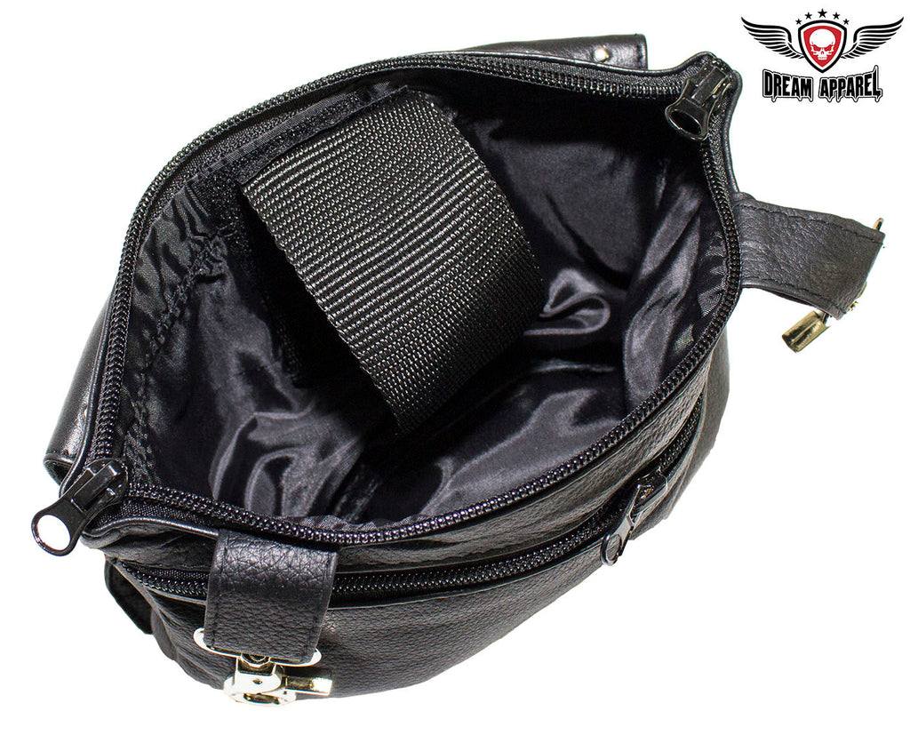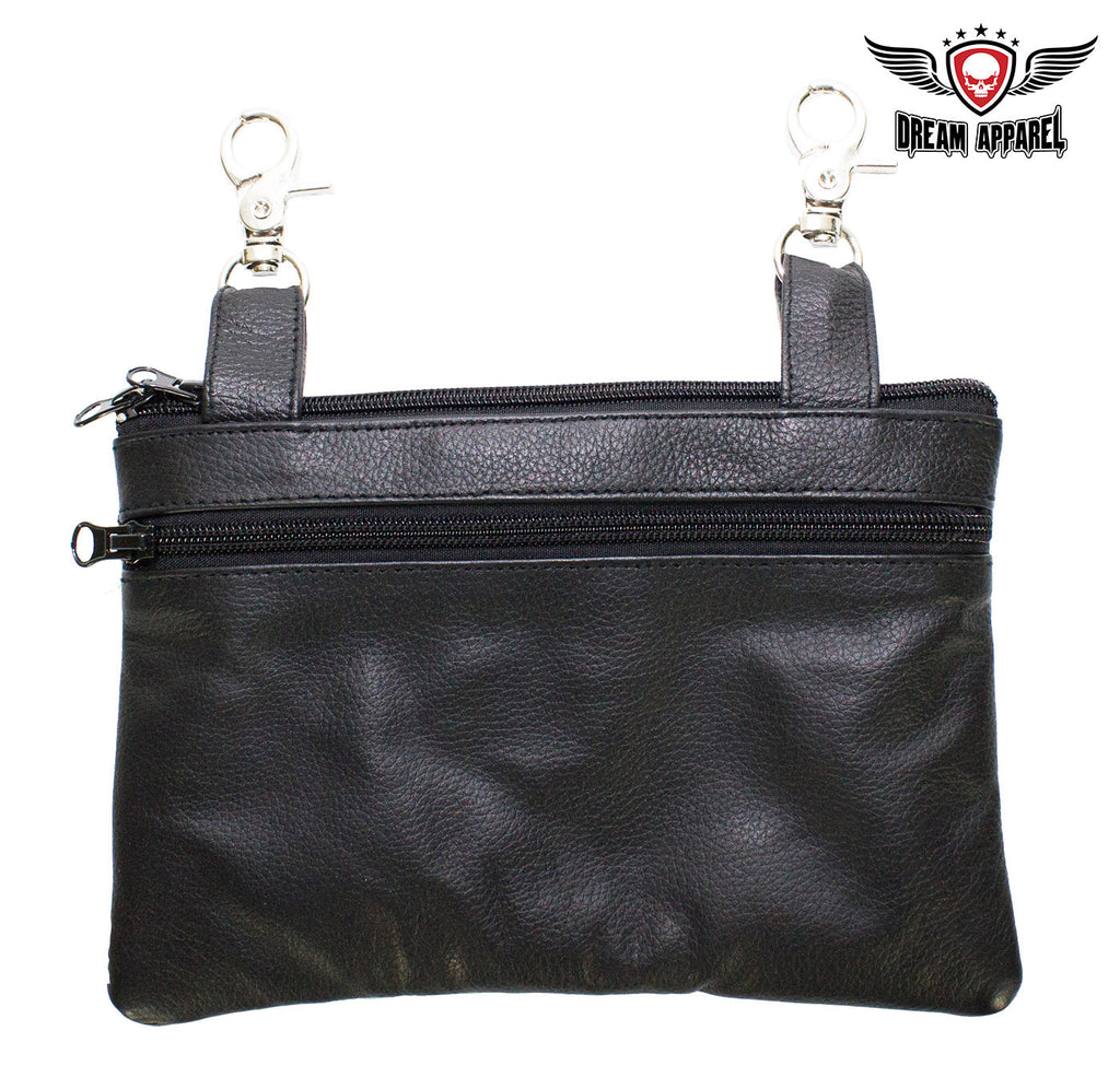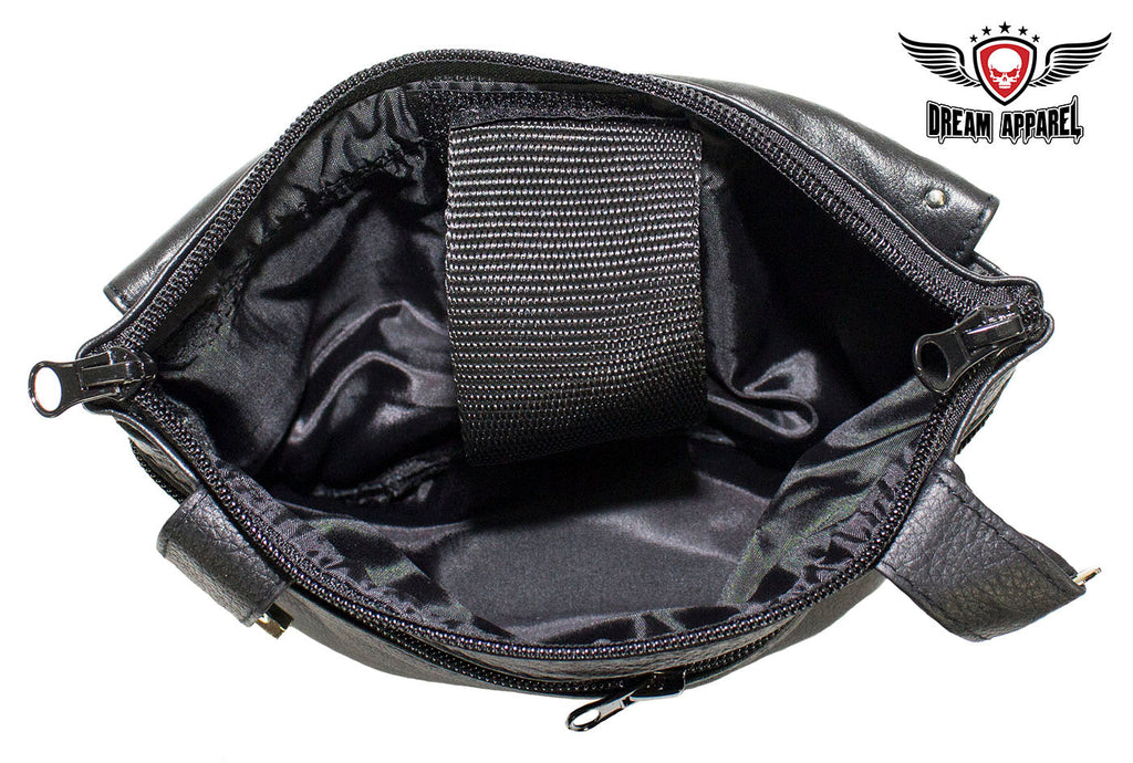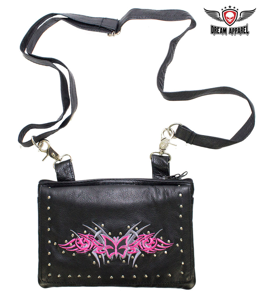 This terrific 9" x 7.5" naked cowhide leather belt bag is perfectly made for anyone that likes to carry a concealed handgun. A zippered compartment with a strong Velcro strap inside lets you carry any large handgun securely while the large dual magnetic flap pocket on the front and equally large zippered pocket on the back let you carry a large cell phone, other valuables, and more. Wonderfully designed with a black butterfly in a pink and silver graphic on the flap with chrome studs that border the flap and highlight the graphic, it clips securely to your belt loops with two large chrome lobster clasps that let you enjoy the freedom, comfort, and safety of riding protected wherever you go.
